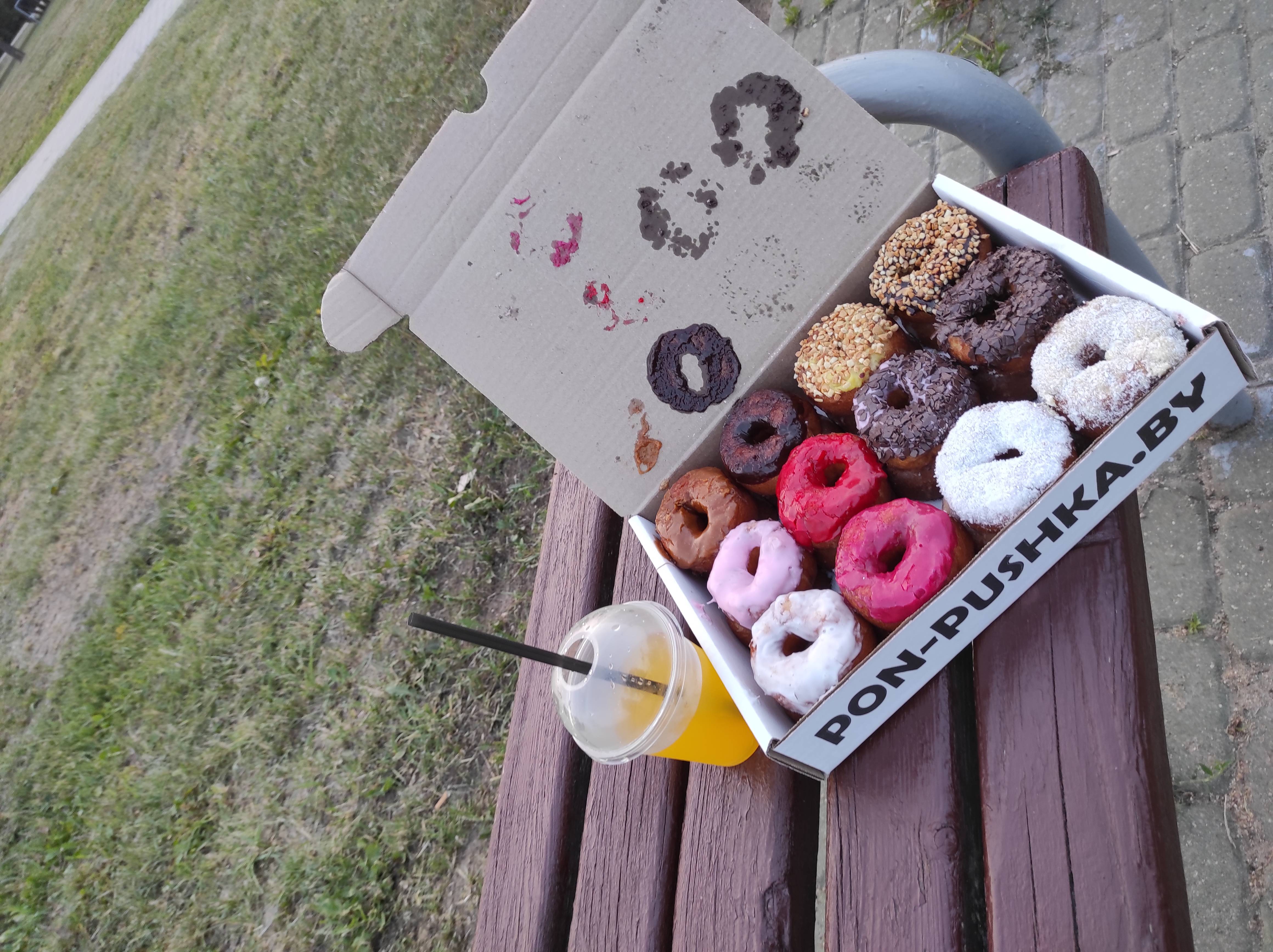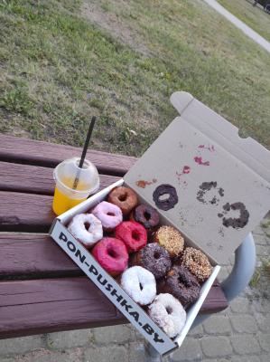 *Вкусы глазури и посыпки на пончиках в боксе выбираются случайным образом исходя из наличия в момент формирования заказа.