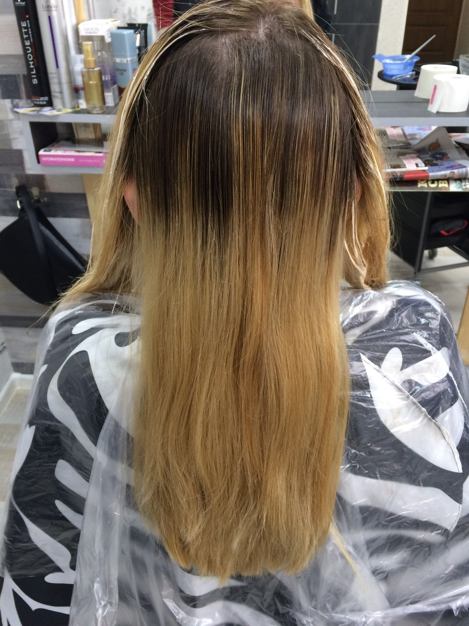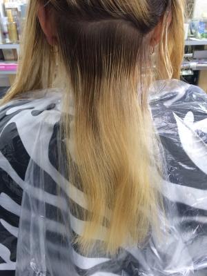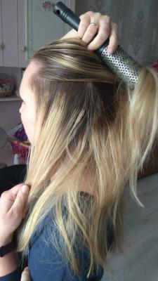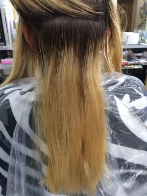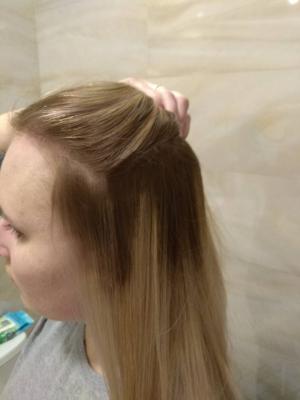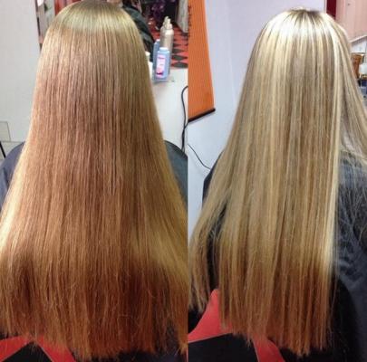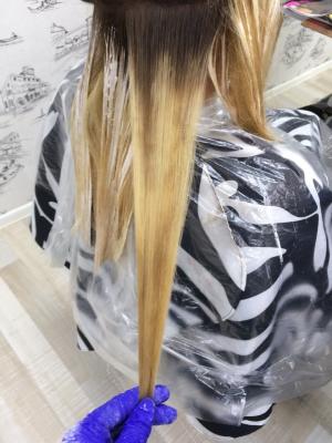 при окраске волос ниже лопаток, волос не густой, блондинка.