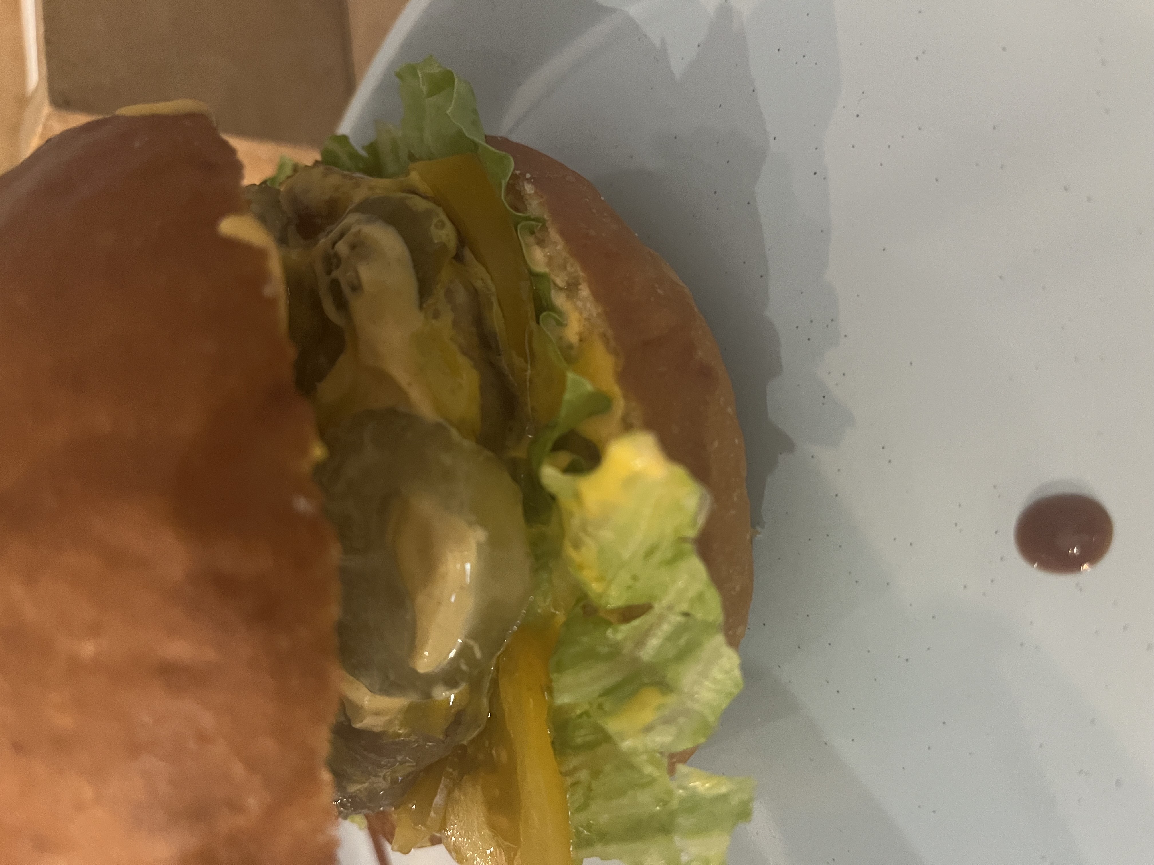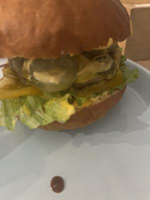 Состав: булка, 2 котлеты гриль, салат, томат, огурец маринованный, сыр чеддер, соус фирменный