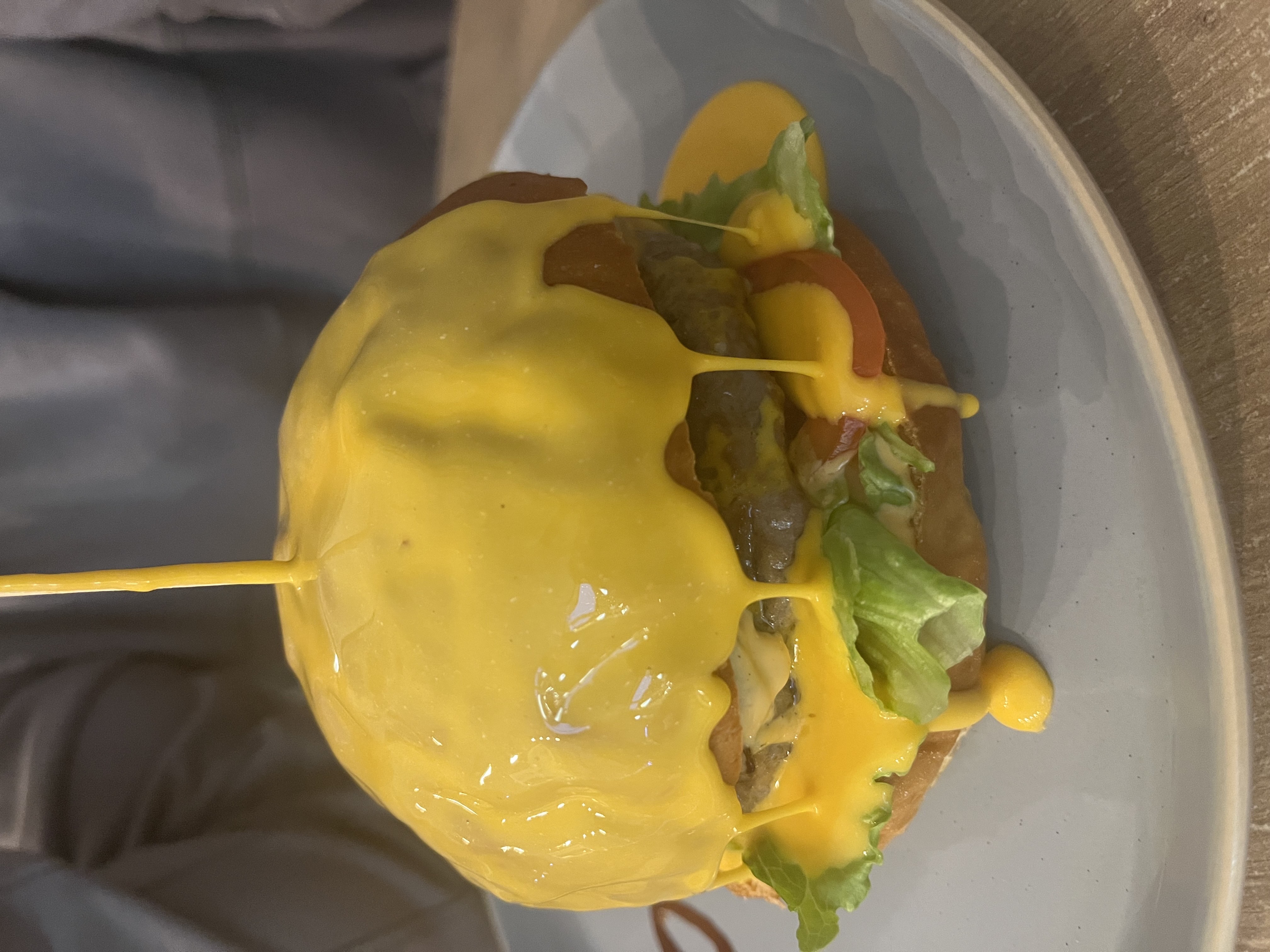 Состав: булка, котлета гриль, бекон, салат, томат, огурец маринованный, соус фирменный, жидкий сыр, лук