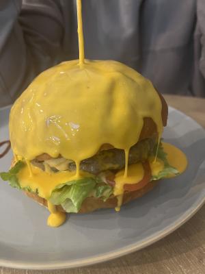 Состав: булка, котлета гриль, яйцо, салат, томат, огурец маринованный, сыр, соус фирменный