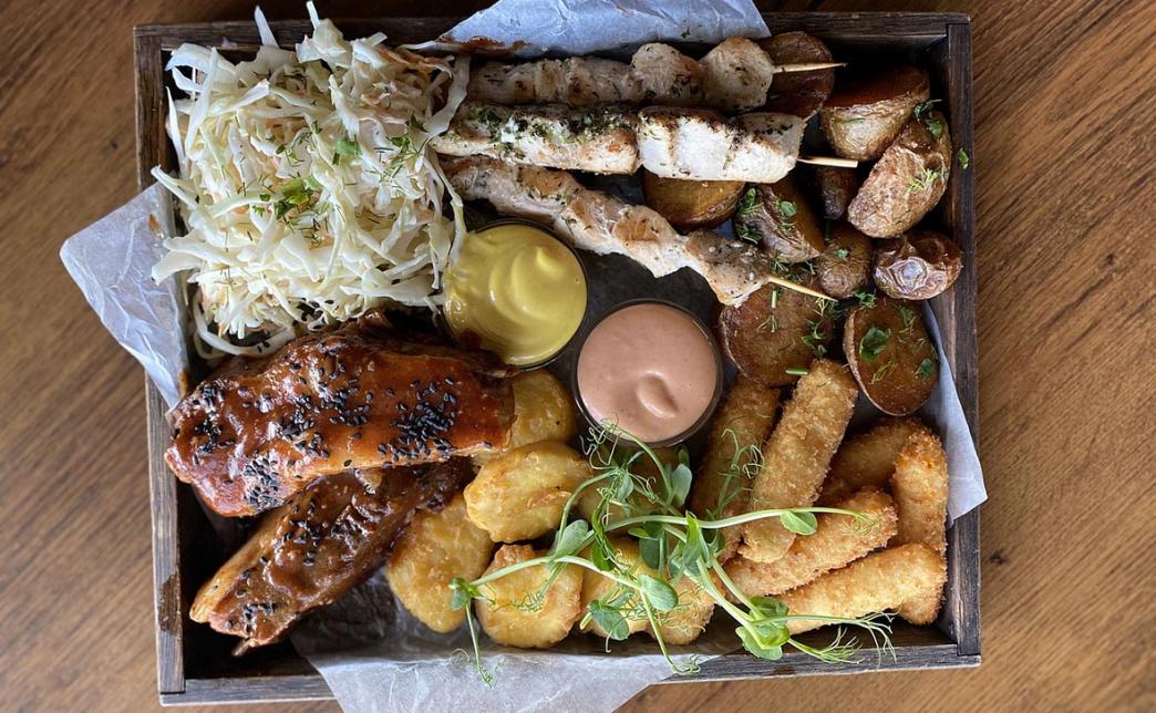 - рваный бургер (рваная свинина, салат коул-слоу, сыр сулугуни, лук фри, соус фирменный)