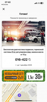 - Один промокод - обслуживание одного автомобиля со скидкой.