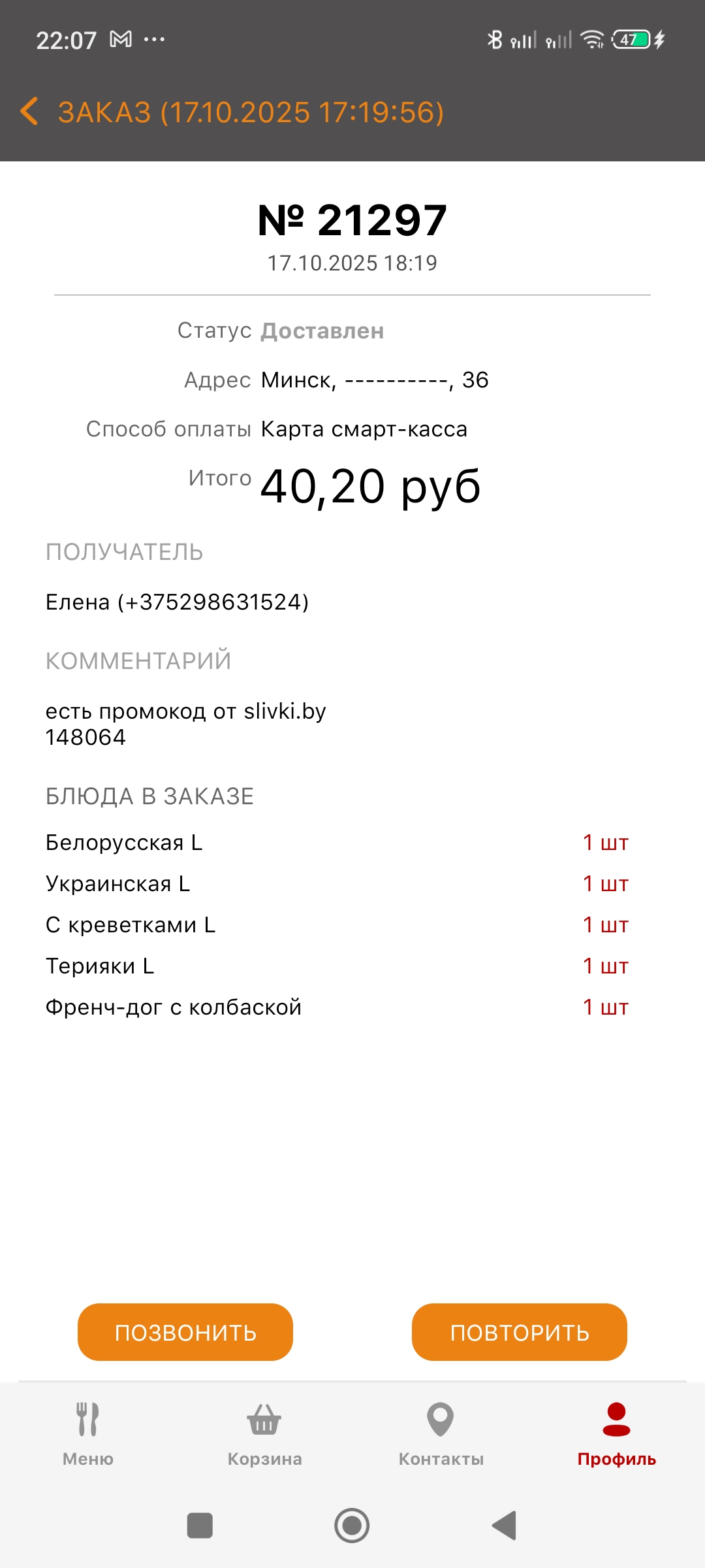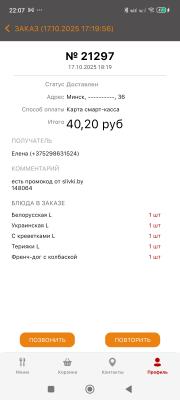 Нам жаль, что Вы остались недовольны своим заказом 😔. Вся информация передана в ресторан для обработки и принятия мер по улучшению качества. Замечания по работе курьерской службы переданы руководителю отдела доставки. В мобильном приложении промокод вы можете ввести в специальном поле в корзине, вверху слева. Для возврата денежных средств за промокод Вам необходимо связаться с поддержкой сайта Slivki по номеру телефона + 375 29 608 22 22, но хотим отметить, что воспользоваться промокодом Вы можете весь срок его действия. От всей компании Art Kebab, мы приносим извинения за доставленные неудобства и