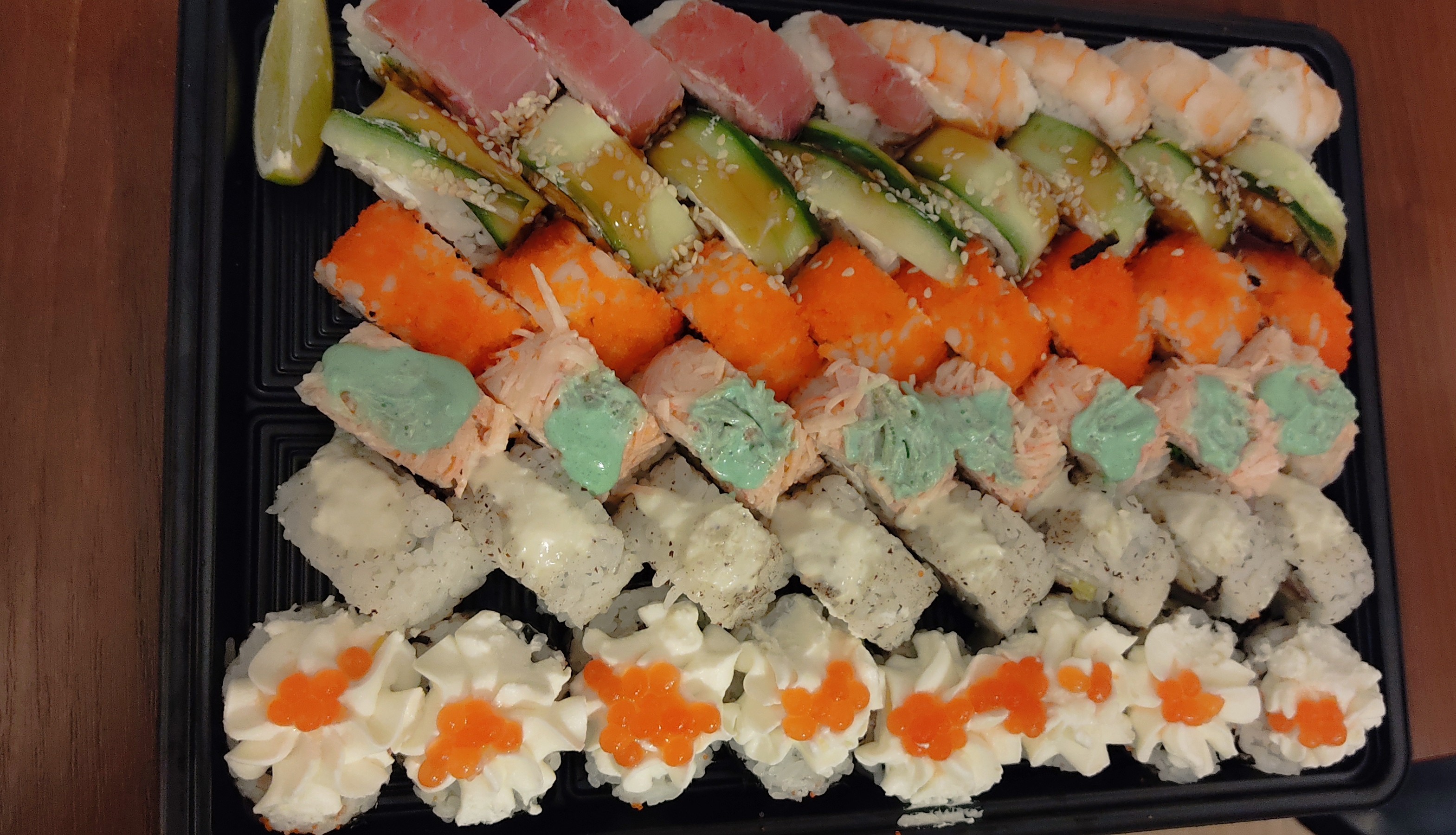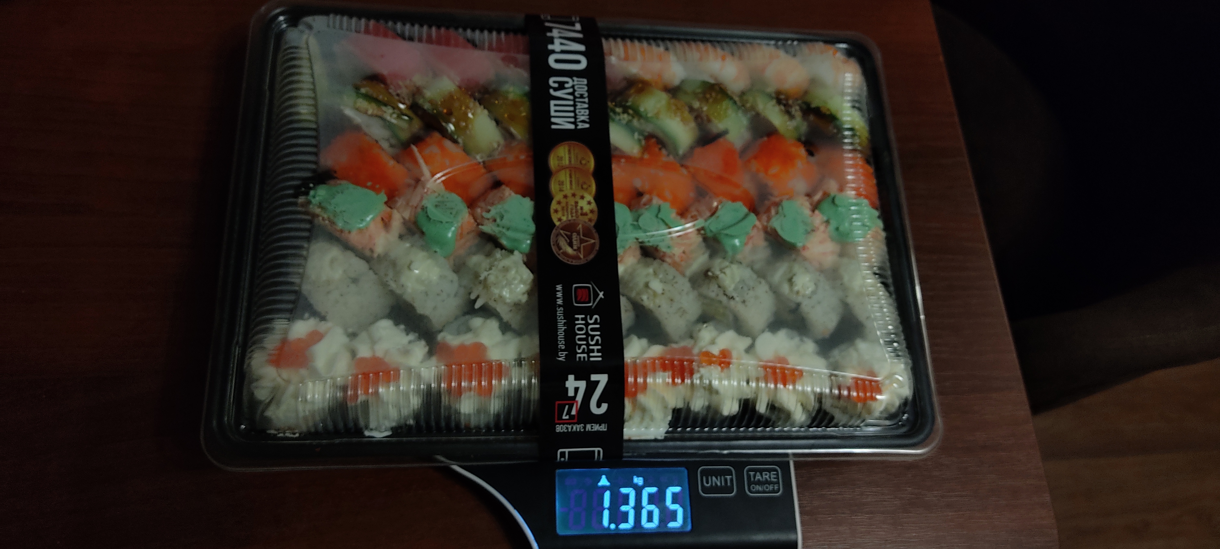 Заказать проблем нет, приготовили быстро, только вместо заявленных 849 гр в сете Тануки оказалось всего 776 гр вместе с коробкой и куском лайма, прямо такое себе