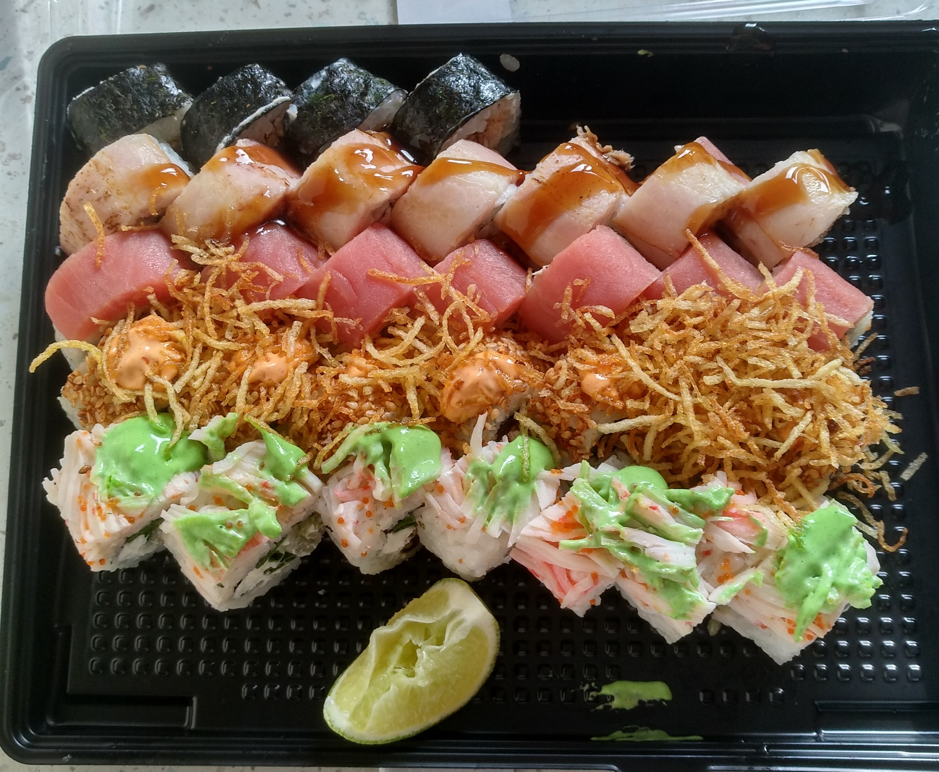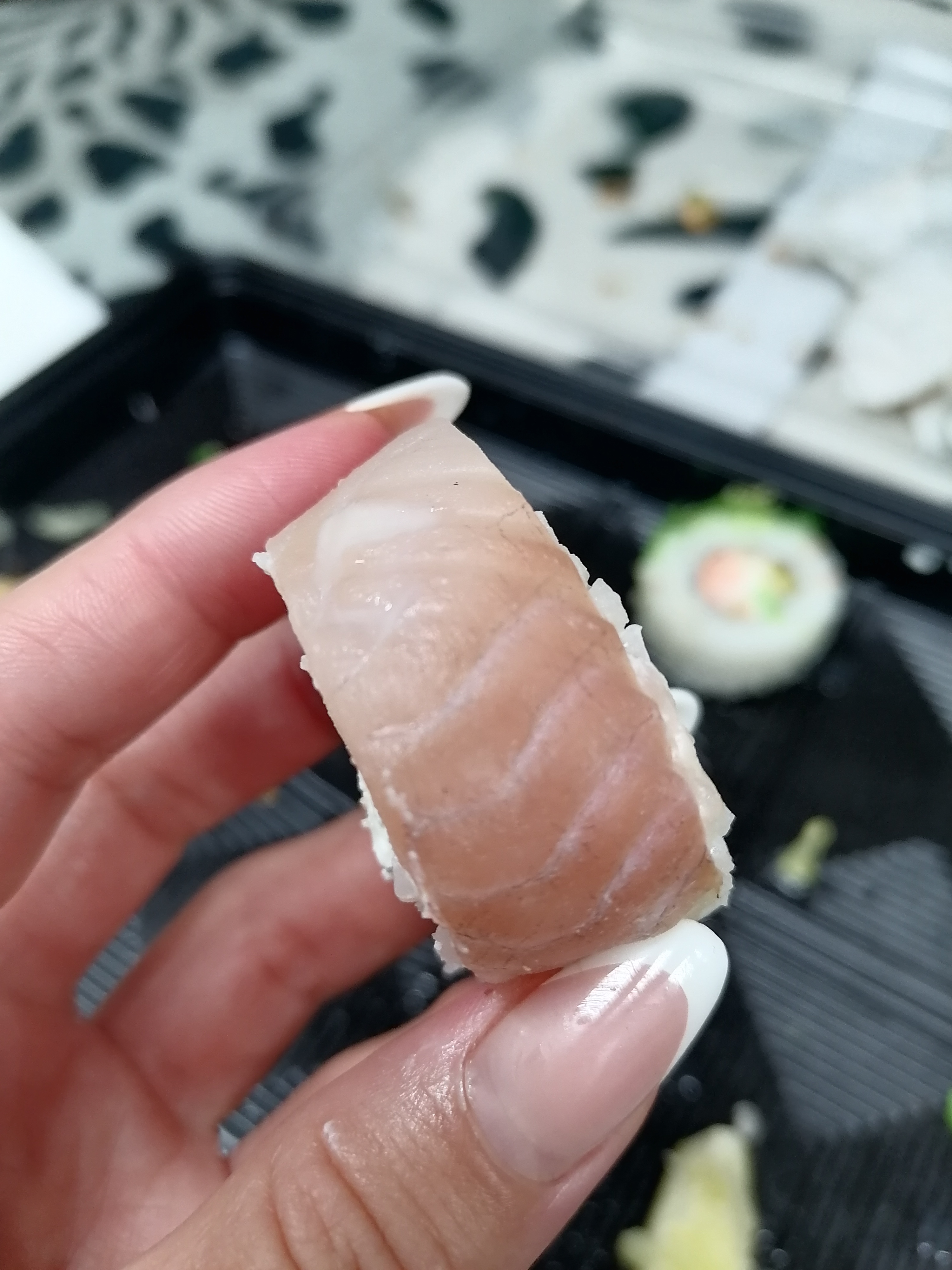 Заказали суши, с доставкой все ок, но сами суши разваливаются, рыба и вся начинка сухая, имбирь так вообще в эту баночку наверное неделю назад сложили и он в таком засохшем виде был, долька лайма с гнилой кожурой, не рекомендую