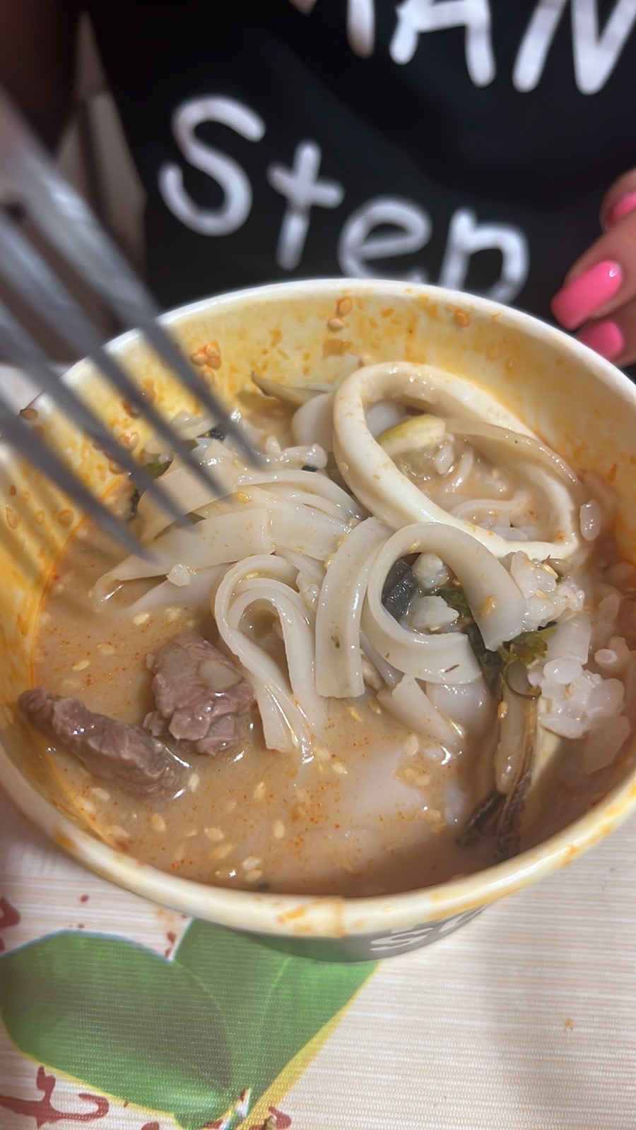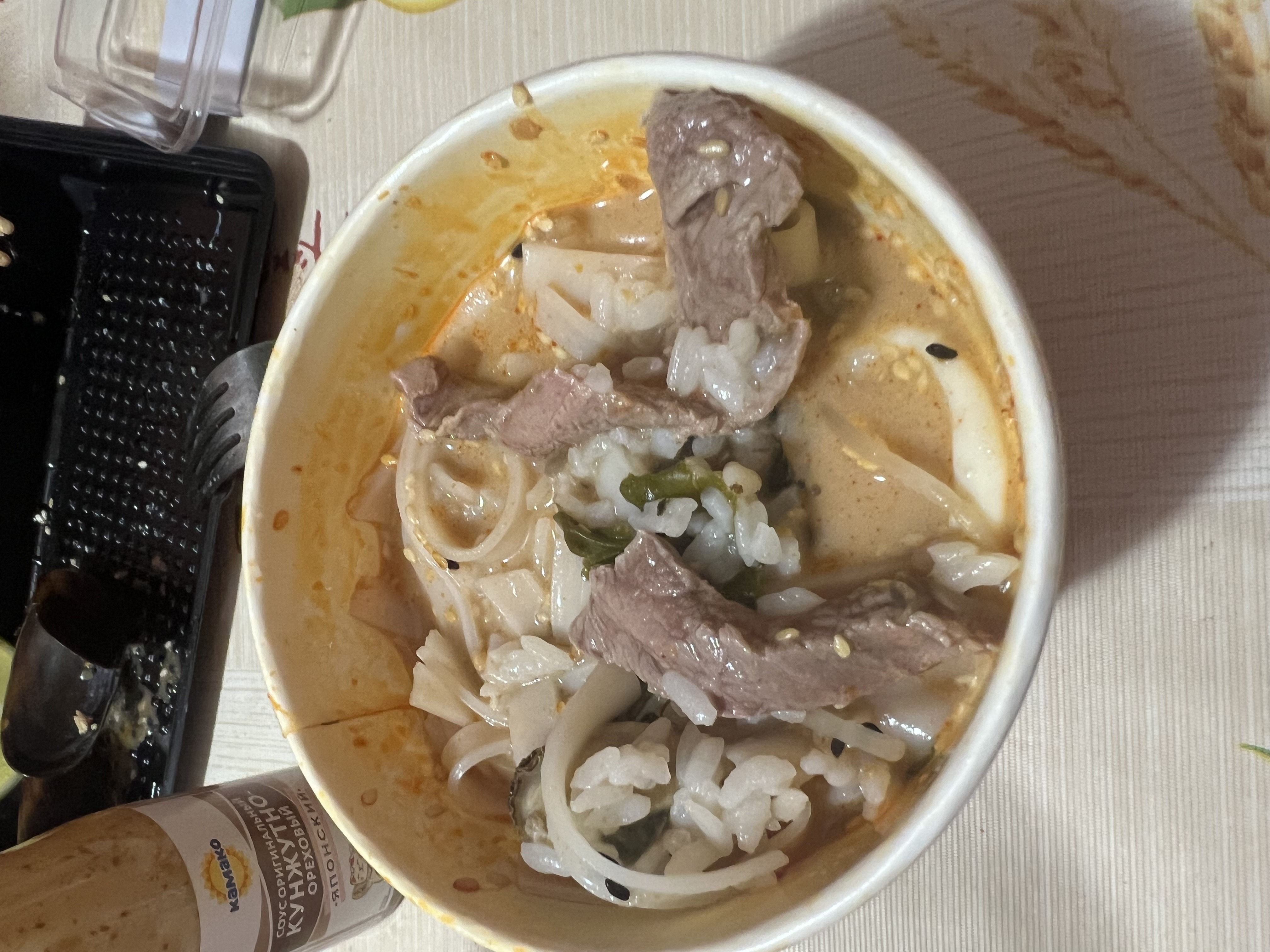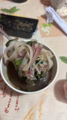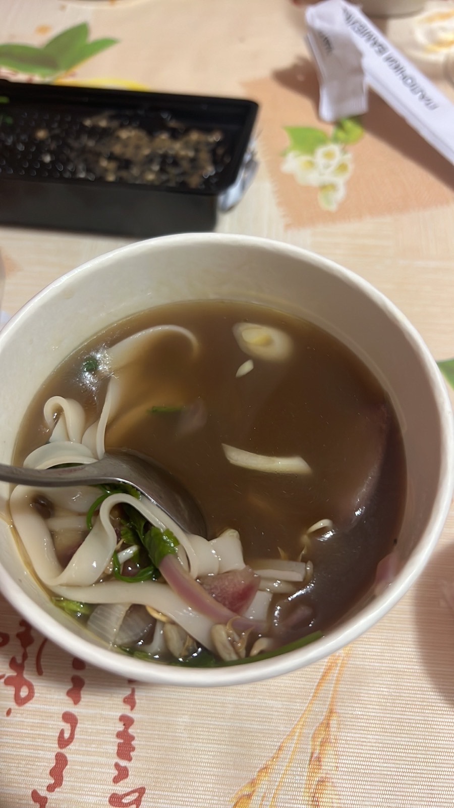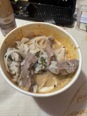 Заказали ночную доставку : суп фобо и суп том ям. Сначала в фобо не обнаружили говядины , а затем оказалось, что они не только в фобо не положили говядину , но зато в том ям положили и говядину и лапшу. В качестве «комплимента» нам привезли новые порции супов и колу 0.5😅 но лучше бы не путали ингредиенты. К тому же фобо оказался горьким