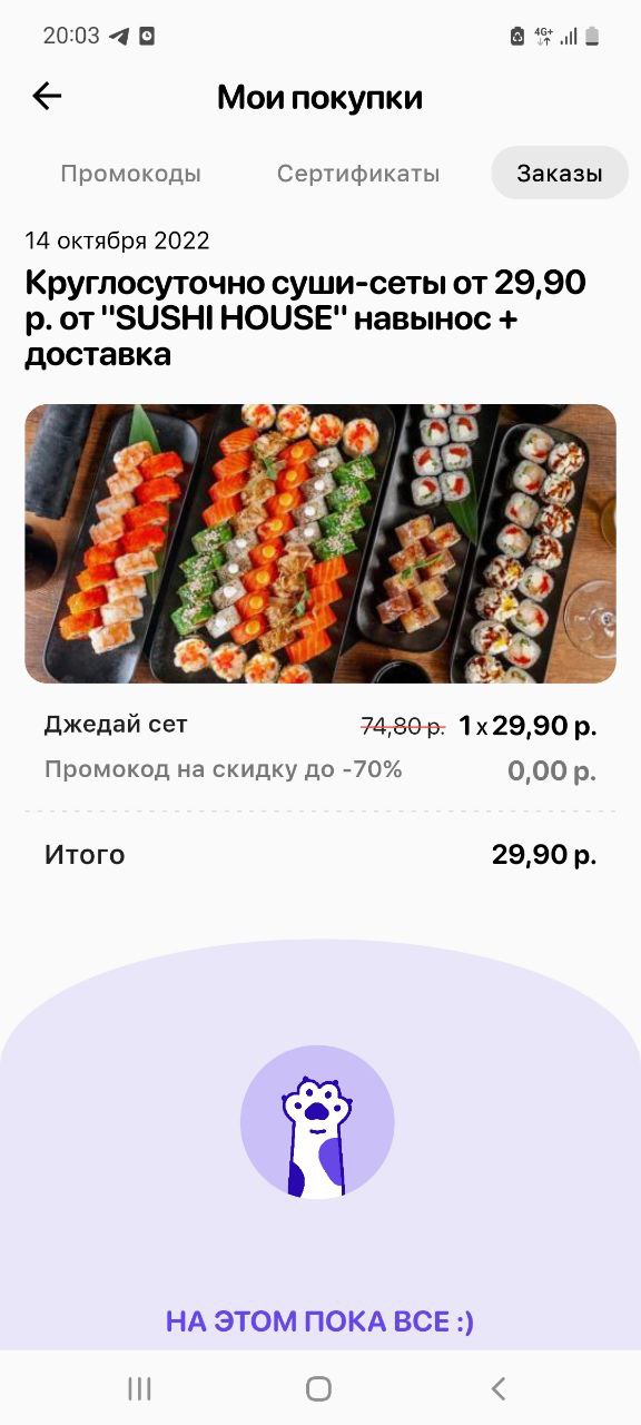- Промокод дает право на скидку до 59% на сет "Анатолий доплатит" от "SUSHI HOUSE"