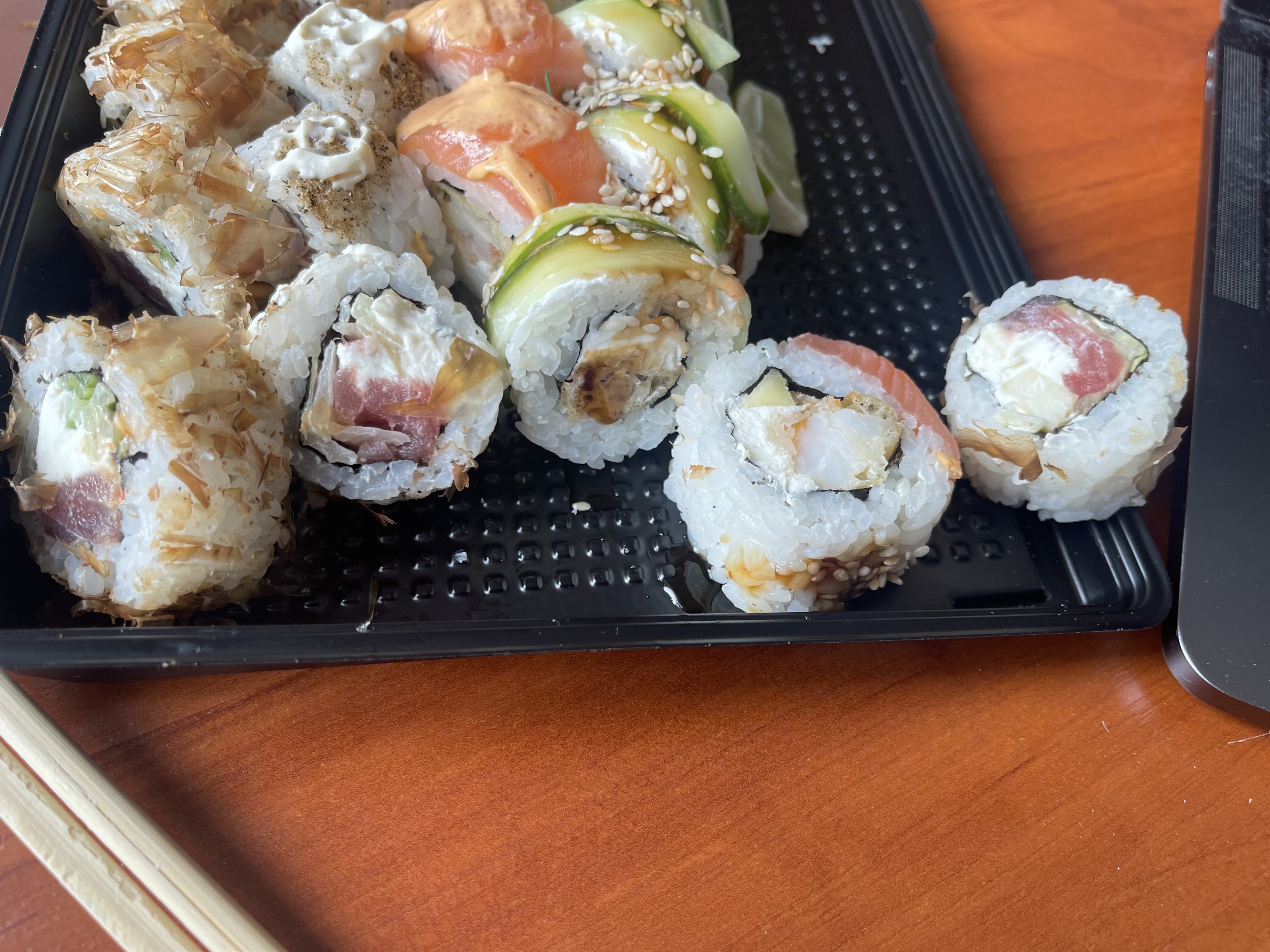 Вроде и неплохо, но есть вопросы. Похоже, что недовес - это проблема в принципе всех суши точек. Вес с коробкой меньше заявленного, отнимаем ещё коробку, и получается, будто бы не доложили ещё пол ролла. В рыбе были найдены кости. Так и должно быть в суши, или рыба все же должна быть там без костей?