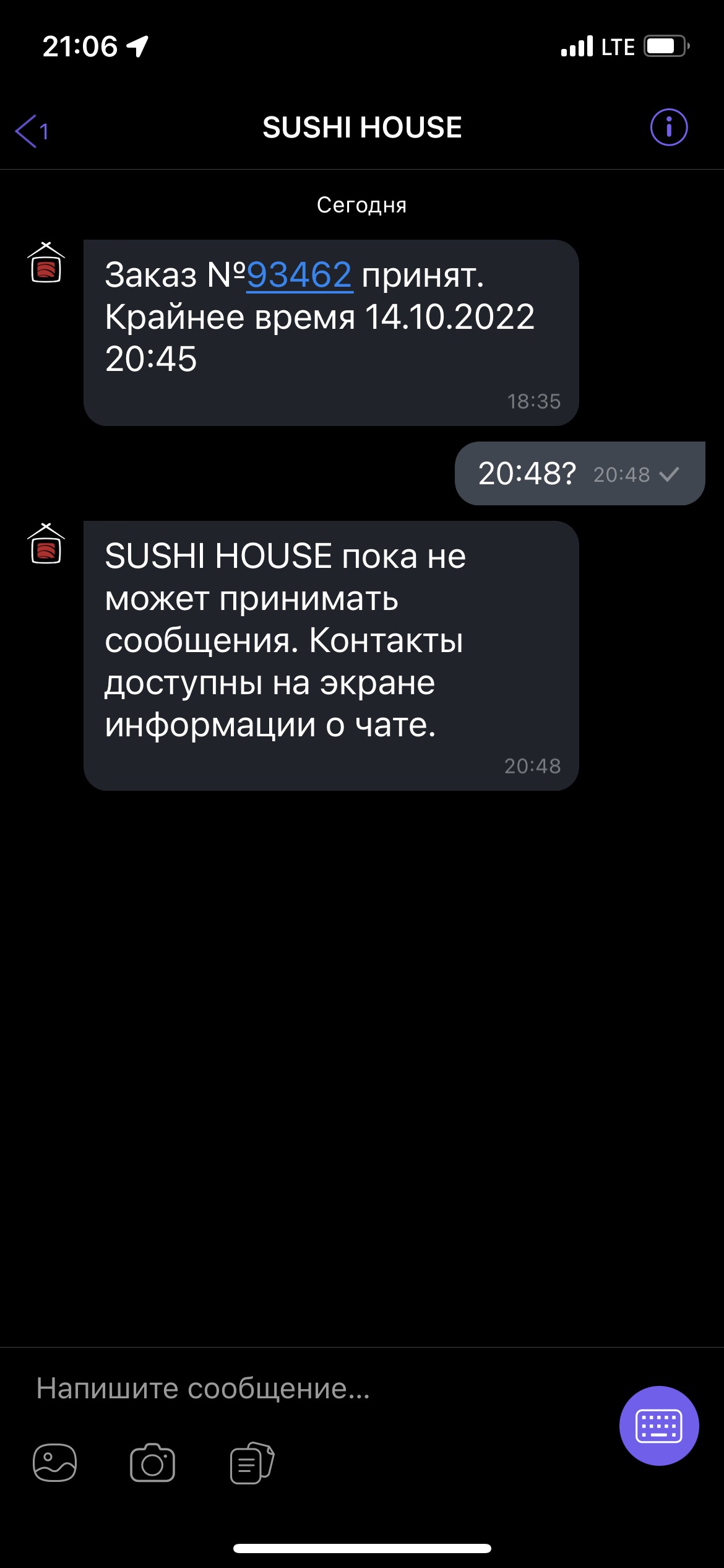 Заказывали суши 14.10.2022 в +-17.40. Перезвонил диспетчер и сказал о времени готовности заказа — в 19.50. Задумались о подтверждении заказа, но сразу решили оставить его. Был заказан самовывоз из ТЦ «Титан», около которого провели время в ожидании заказа. Когда подошло время забирать заказ, на пункте самовывоза сказали, что заказ был отменен. Как это понимать???? Ведь меня никто не предупредил, что заказ не принимают. Плюс были потрачены деньги на приобретение сливочного кода. В итоге остались без сета и потратили время на пустое ожидание. Подскажите, вы ко всем клиентам так относитесь?????? Дико разочарованы в вашем сервисе! Никому не советуем рассчитывать на данное заведение. Хочу получить какой-то ответ на данное обращение.