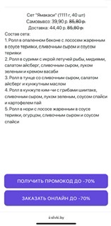- Промокод дает право на скидку до 59% на сет "Анатолий доплатит" от "SUSHI HOUSE"