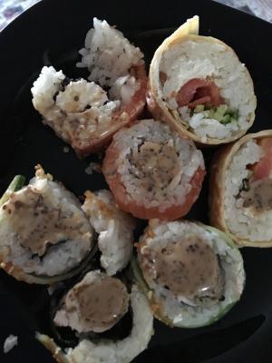 Состав: японский омлет, рис, нори, соус Унаги, кунжут белый