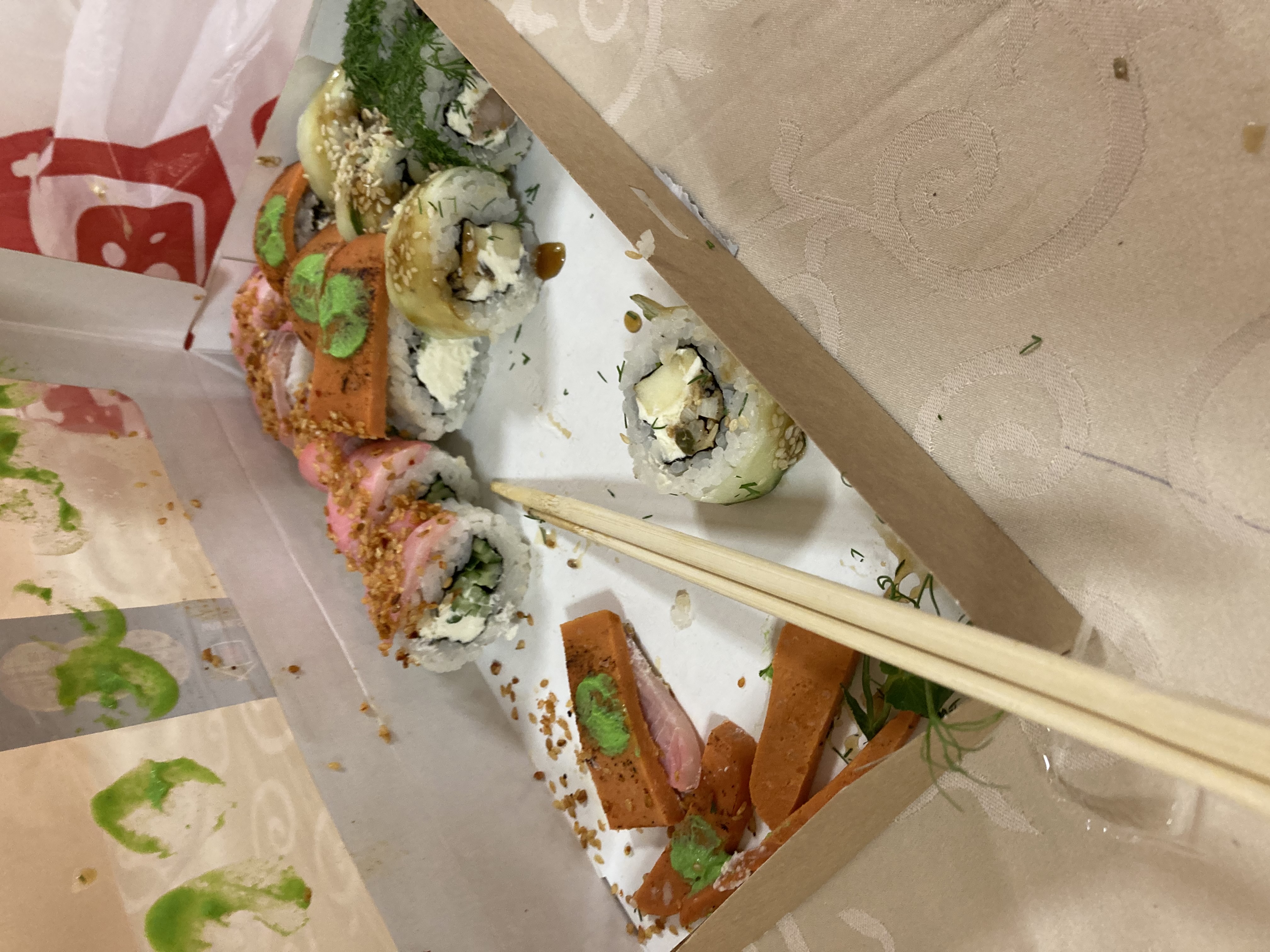 Забыли положить имбирь. Оплату естесственно взяли. Обнаружили только дома. Печально. Дозвониться по телефону для решения вопроса не возможно. Некоторые роллы рассыпались