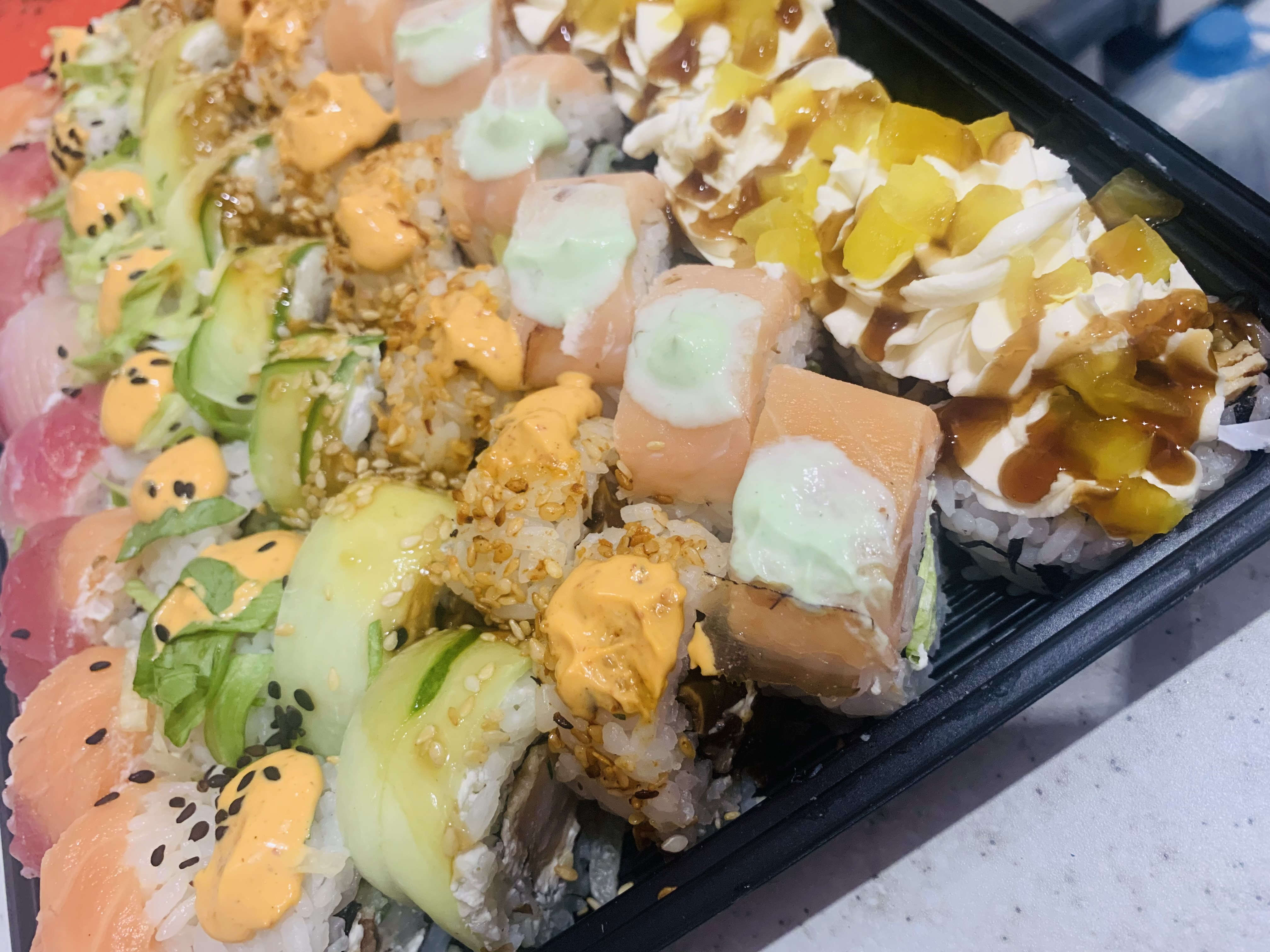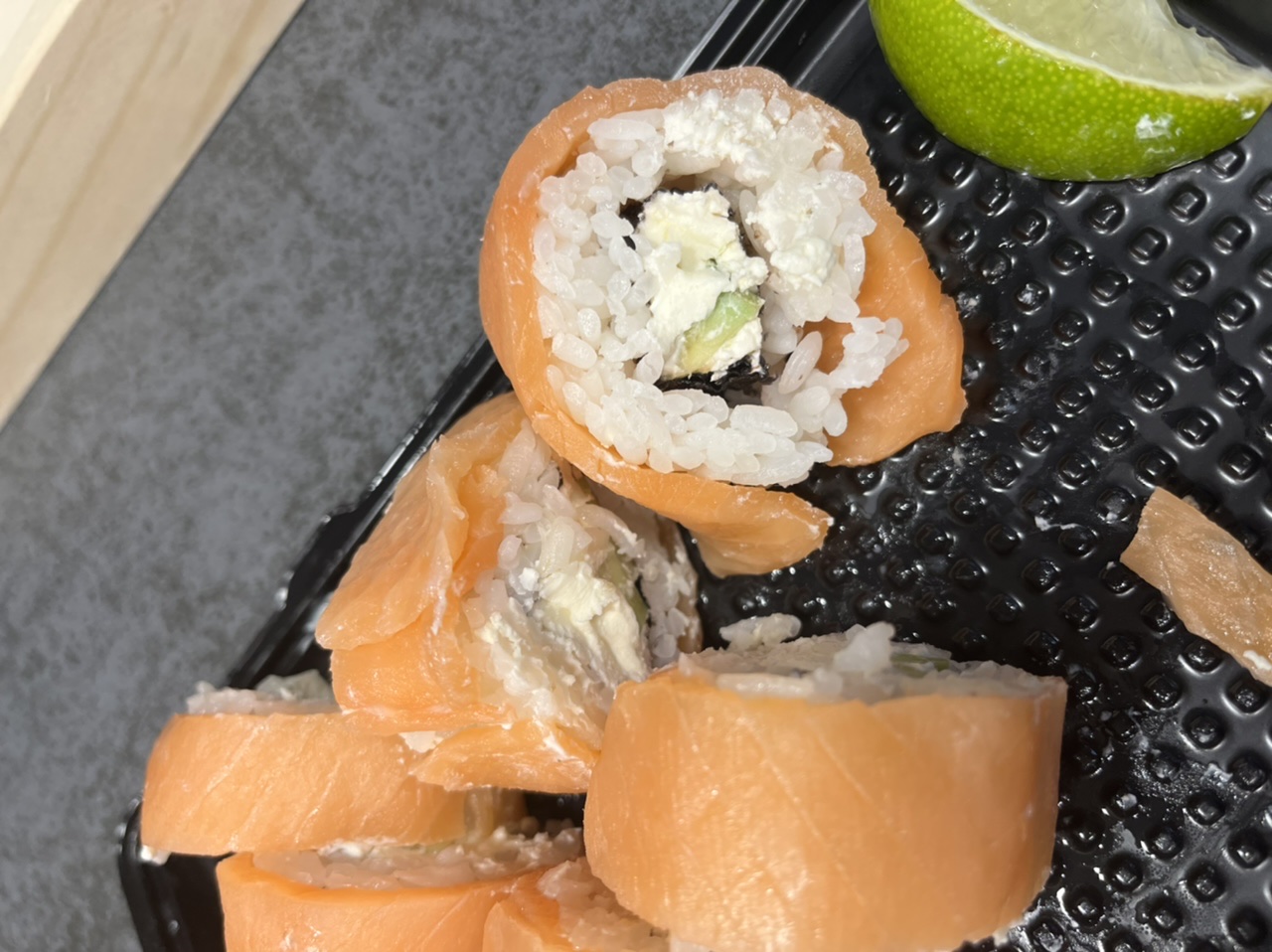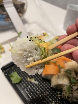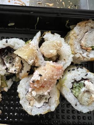 Вчера утром заказали два сета суши заранее, чтобы все было готово во время. Так и вышло, с виду суши выглядели отлично: начинки много, рыбки не пожалели, но вот рис... когда стали брать палочками, то разваливалось все сразу же, невозможно было их в целом виде поднять, они моментально разваливались. Весь рис падал обратно на тарелку, а начинка оставалась в палочках... Решили прибегнуть к вилке, но и даже это не помогло, весь рис сразу осыпался и не держал форму суши от слова совсем... было очевидно, что рис был приготовлен некачественно, про рисовый уксус с сахаром они вообще забыли, а это важные ингредиенты для приготовления суши. У них получилась рассыпчитая каша, но не рис для суши! Вечер был испорчен!!