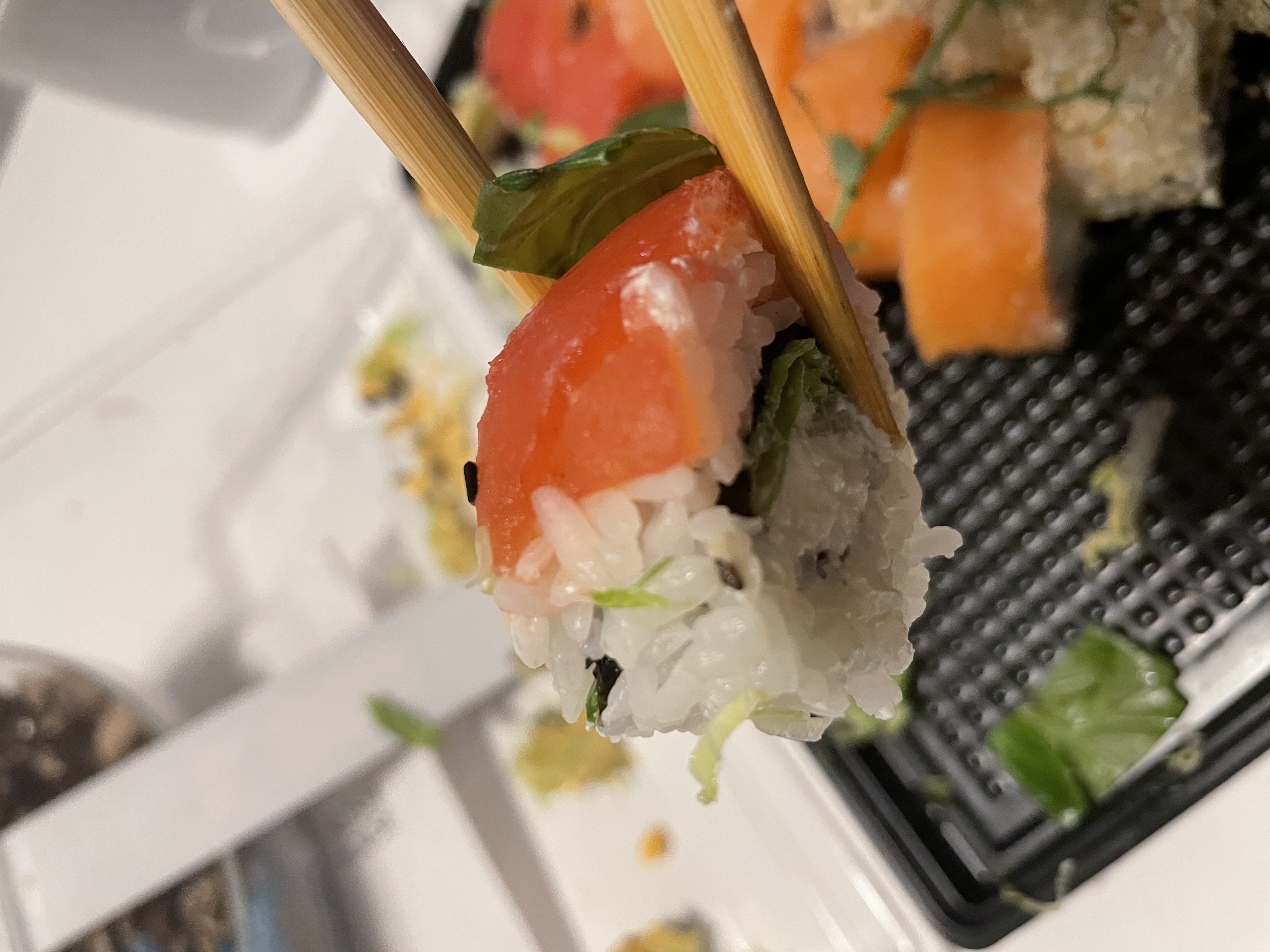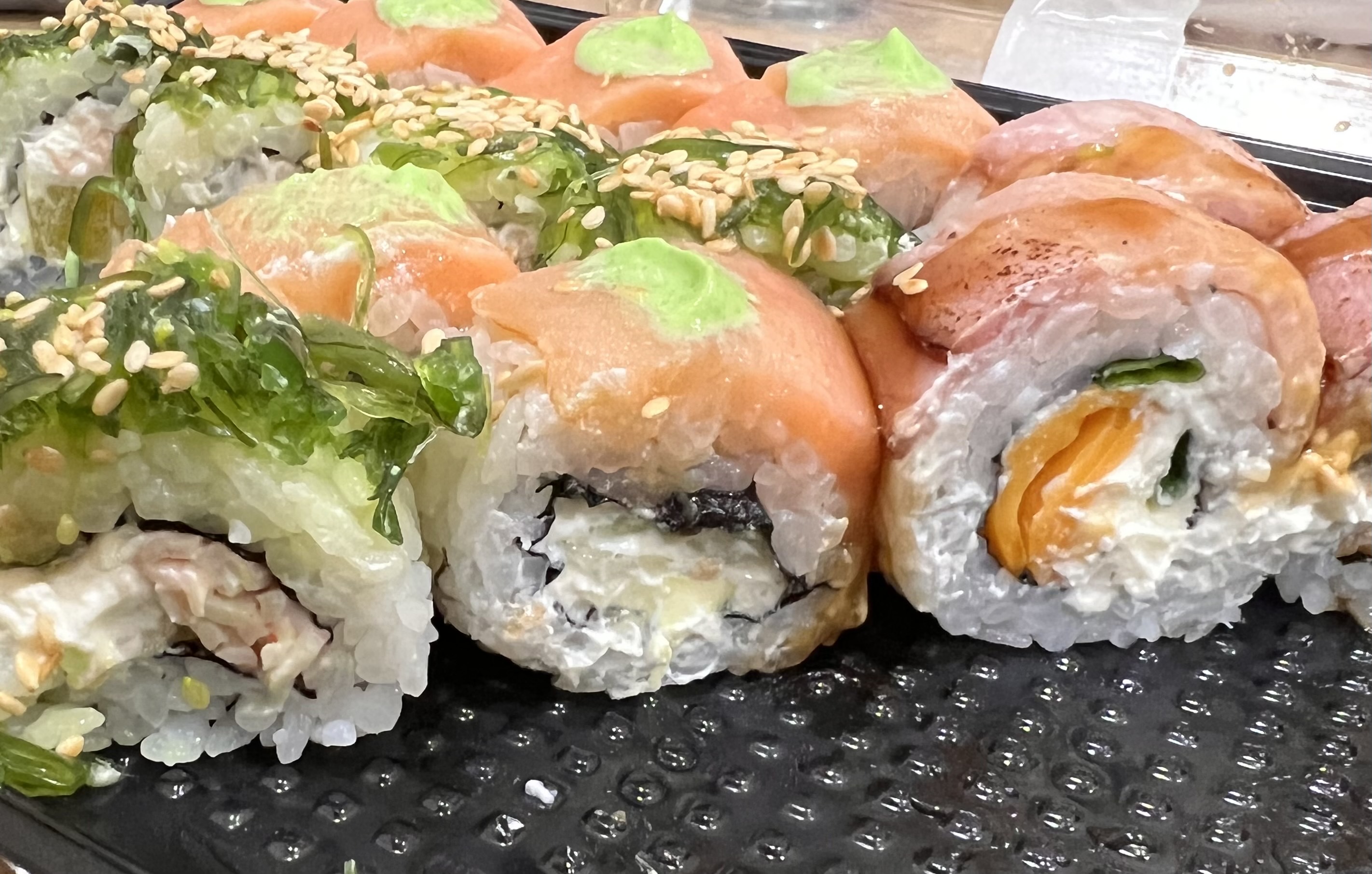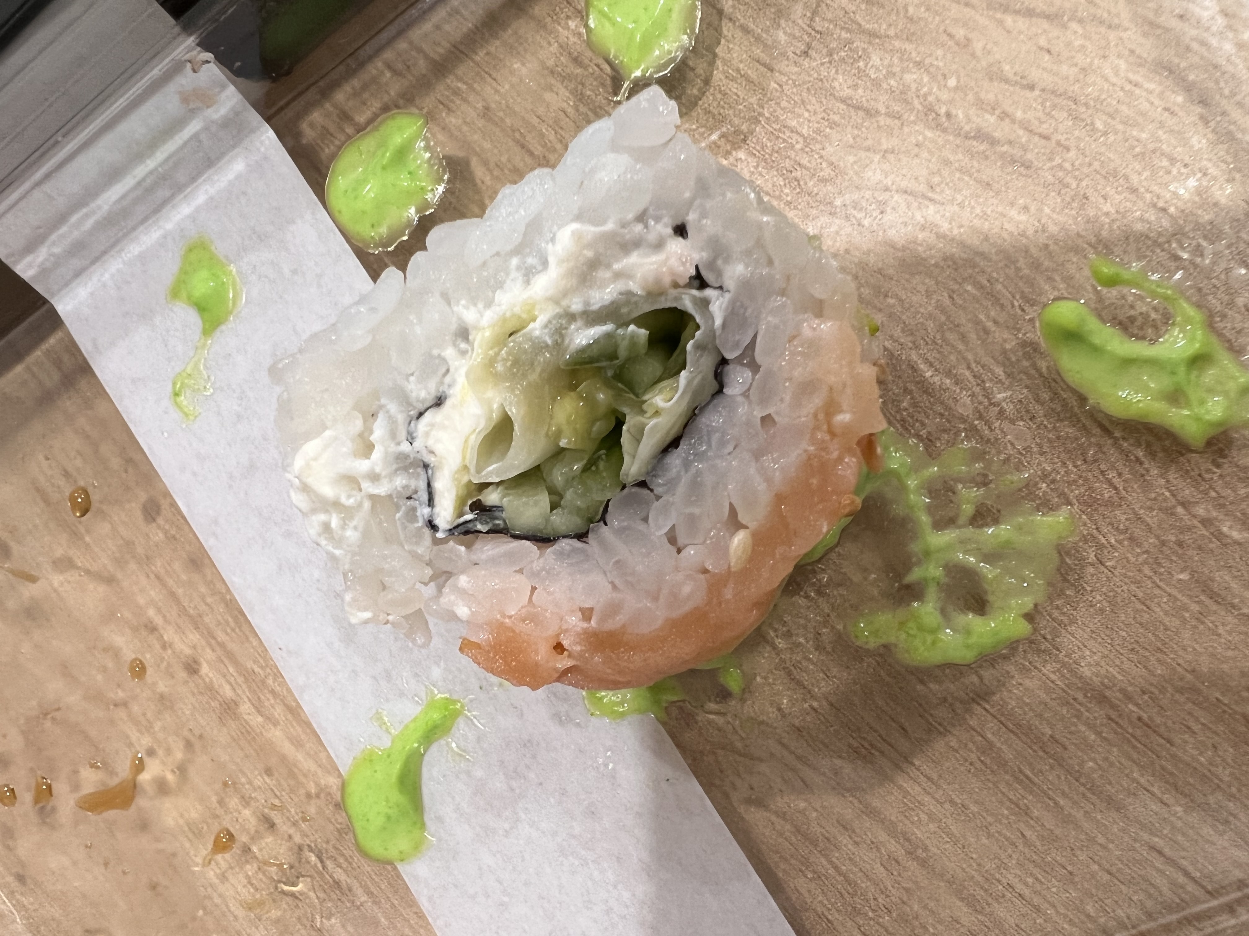 Рис был немного недоварен. Ролл в лососе, тунце и морском окуне - рыба переморожена, безвкусная. Вкус был только у окуня, но лучше бы не было - очень сильный привкус сырости.