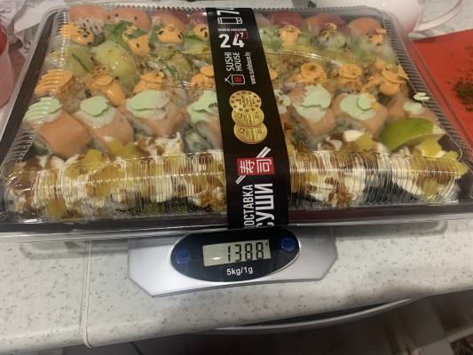 Заявленный вес 1387 грамм, вес привезенных суши вместе с упаковкой (контейнер с крышкой) 1305 грамм.