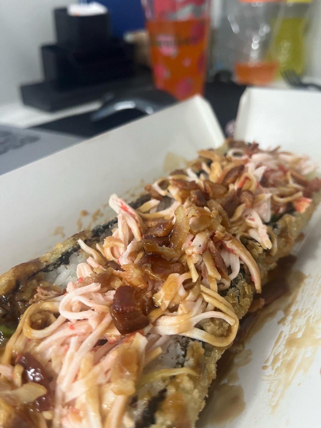 Состав: краб микс, сыр чеддер, огурец, чипс бекона, сливочный сыр, соус терияки, кляр, сухари панко