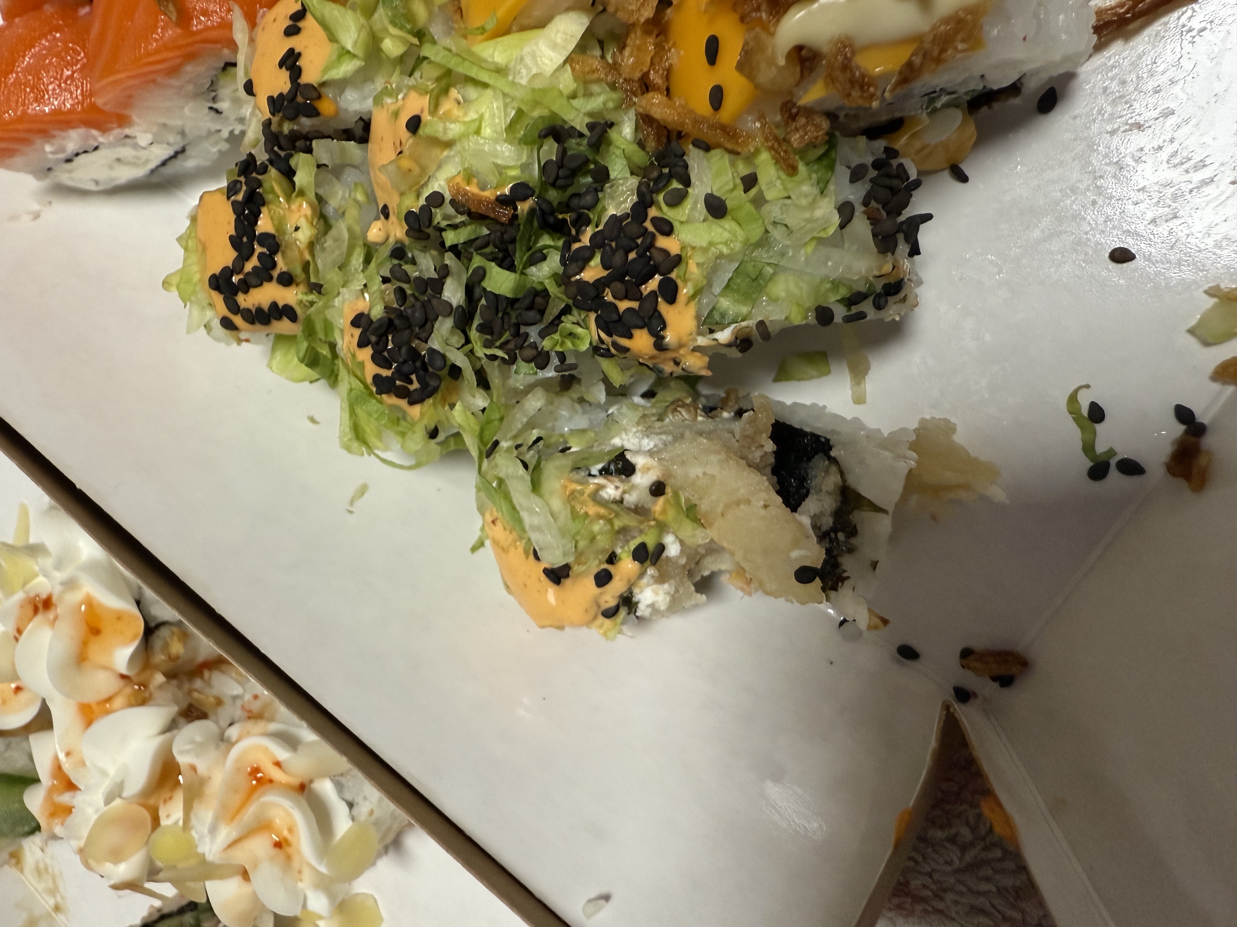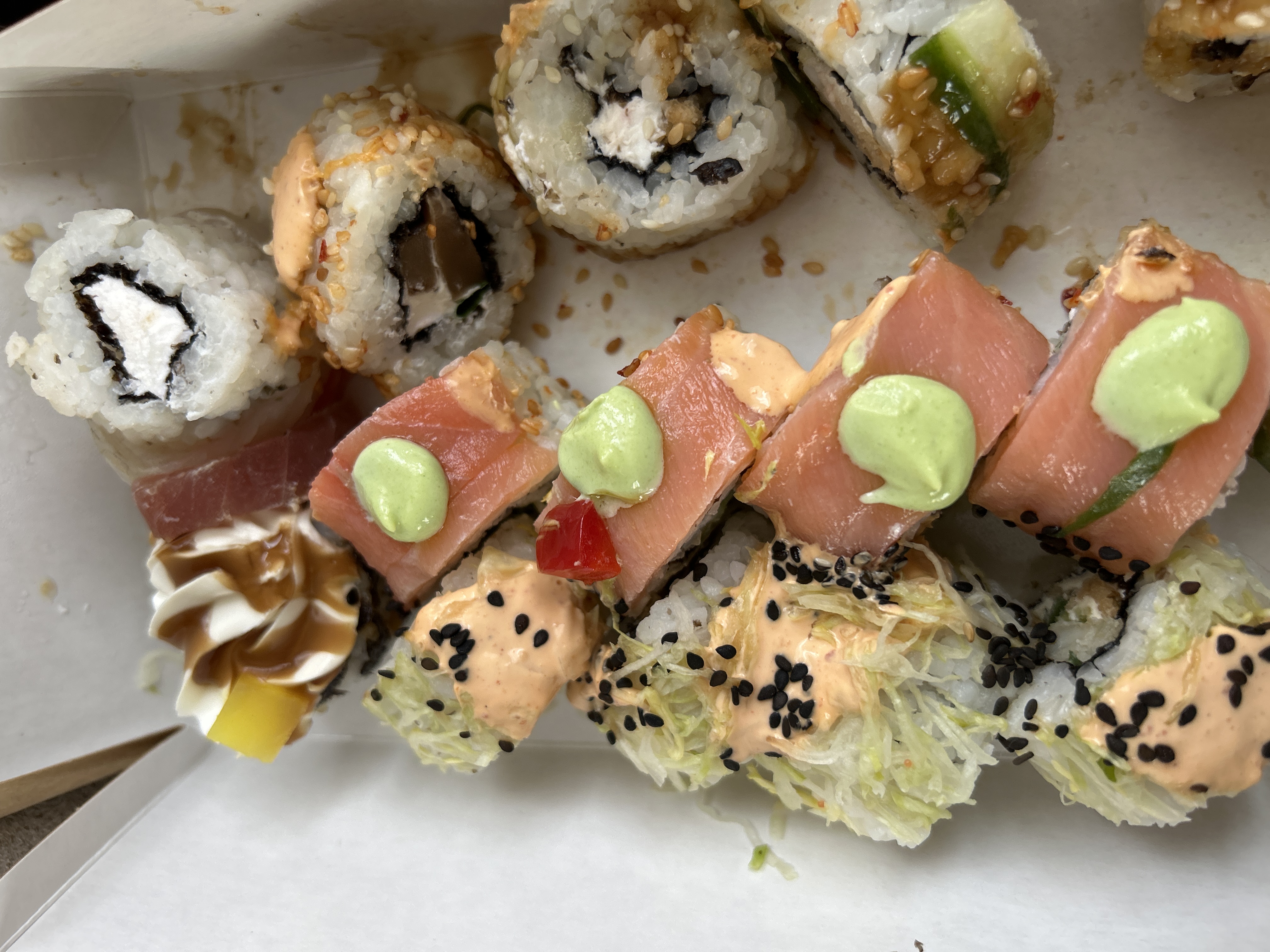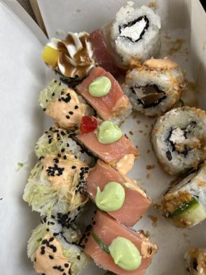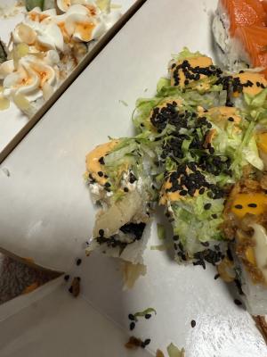 Состав: лосось, огурец, сливочный сыр, соус спайси, кунжут кимчи, соус терияки, кляр, сухари панко