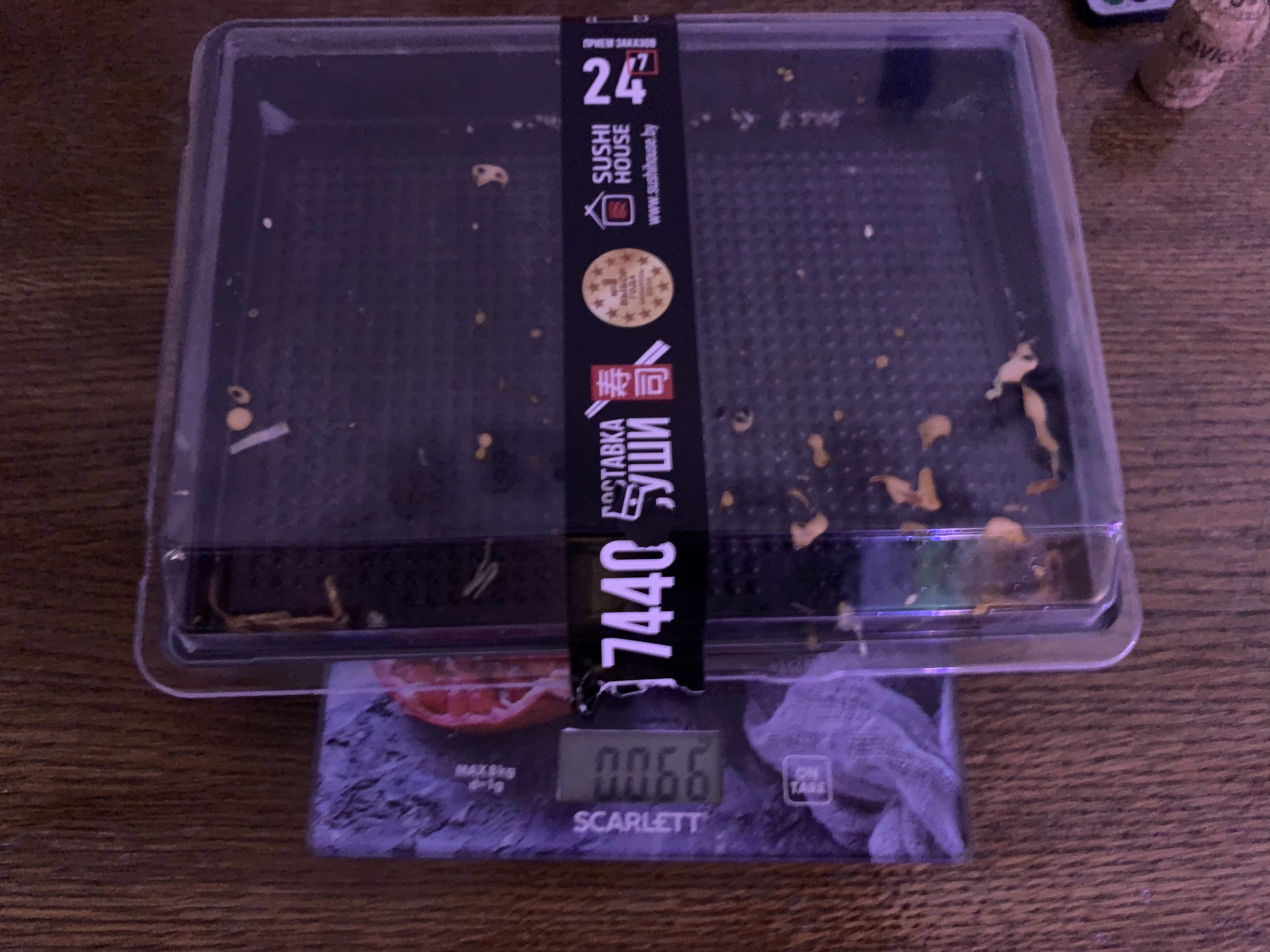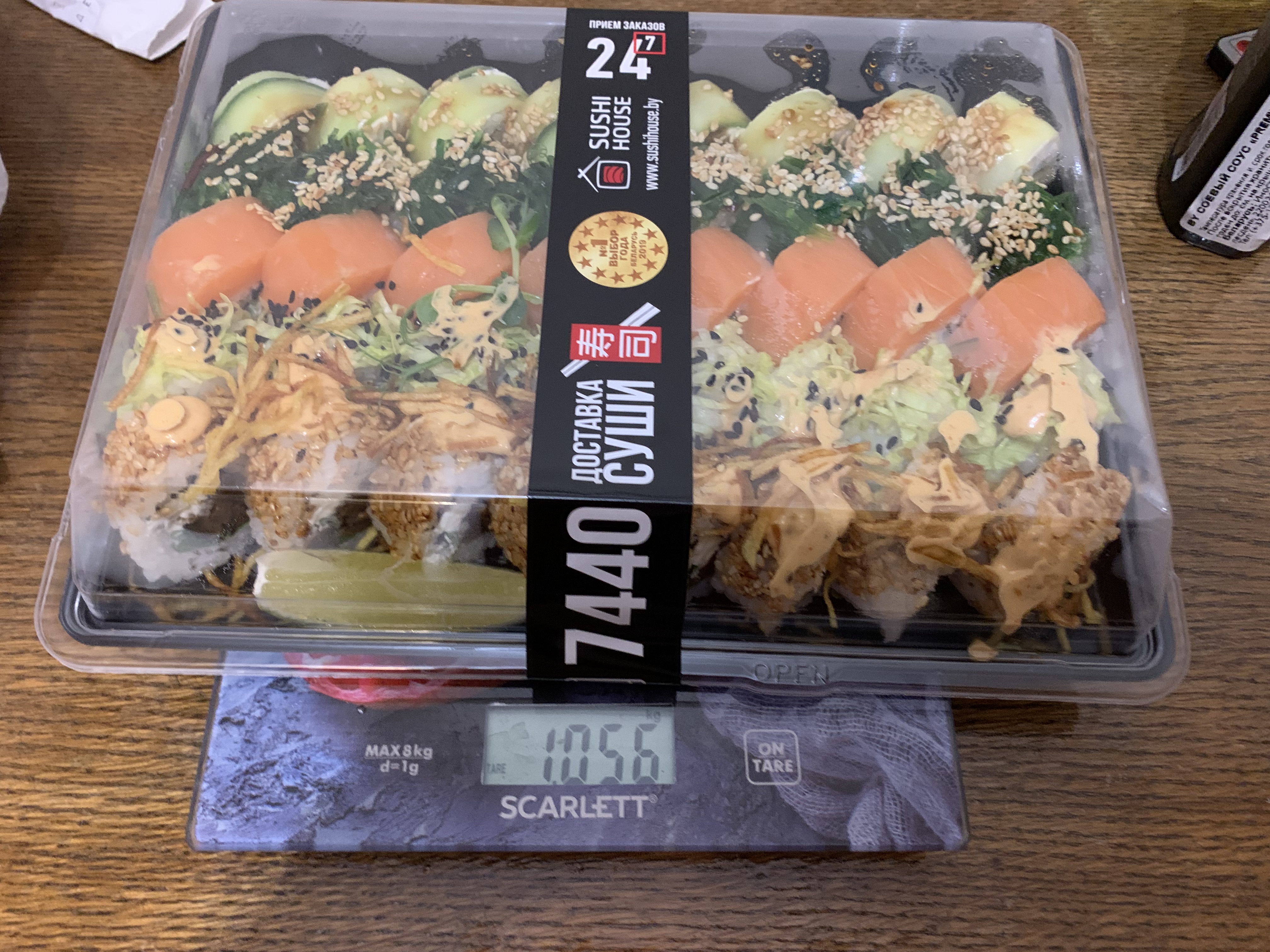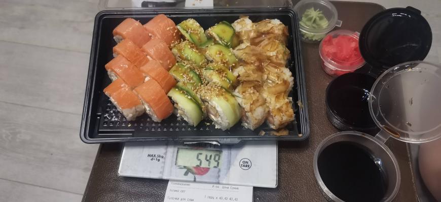 Как указано при заказе сет должен весить ~1100 грамм. Заказывали самовывоз с З. Бядули. Сет который нам дели весит 1056 г с коробкой!!! Коробка весит 66 г. Итого сет весит даже меньше килограмма. Тут разбежка даже не в 10-20 гр. Очень обидно. Рис максимально сухой.  Несвежие. Начинки немного.  А ещё в одном из роллов мне попалась песчинка. 😐 Полный провал.