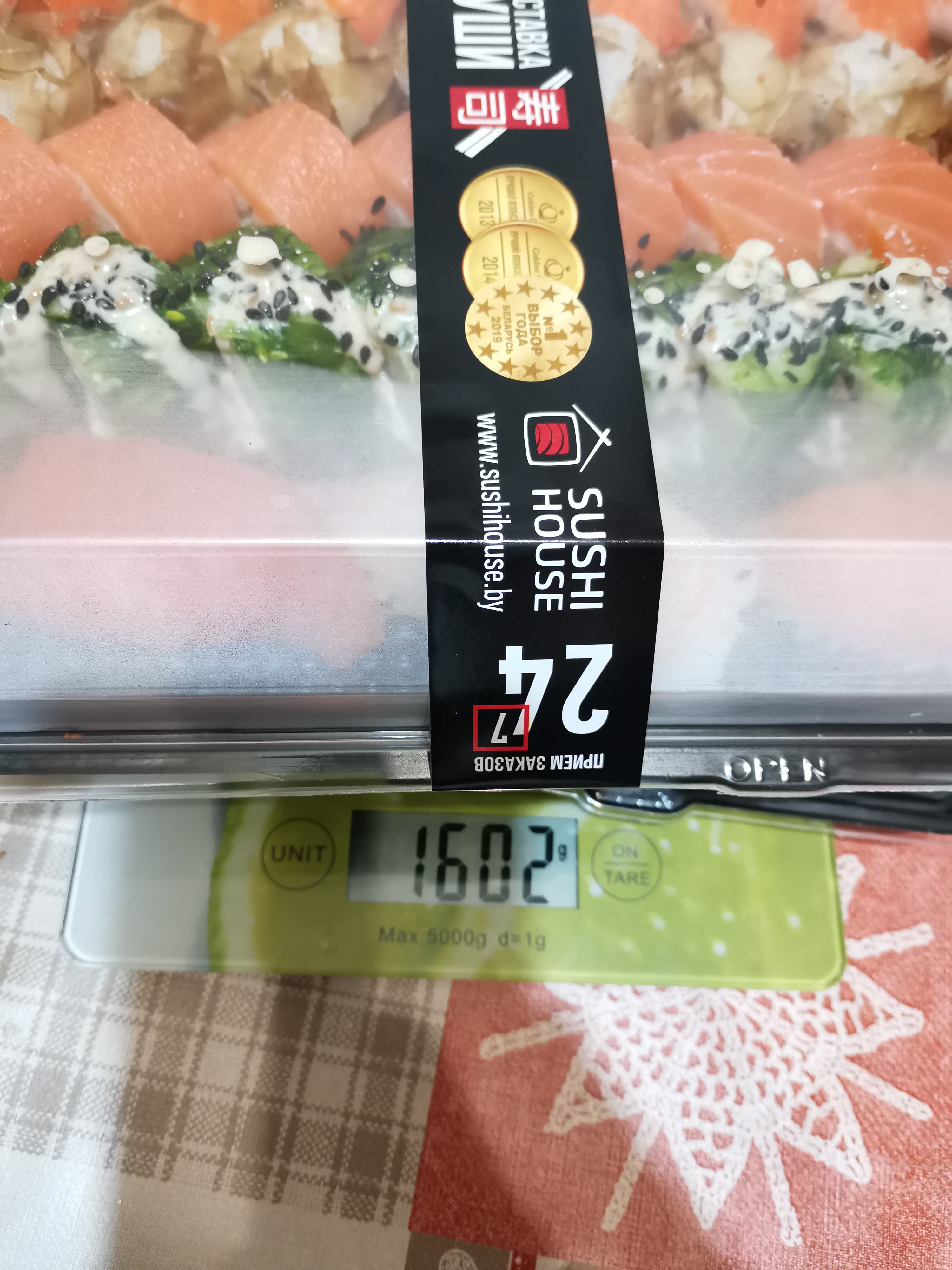 Заказывал сет "весёлая компания". Заявлено 1646г. После взвешивания в контейнере получилось 1602г. На вкус - средние суши, заправлен рис не очень, скручены так себе(разваливаются). Были заказаны около 14:30(доставлены во время)Скорее всего в это время и скручены. Звонил сам несколько раз, но кикто не ответил...