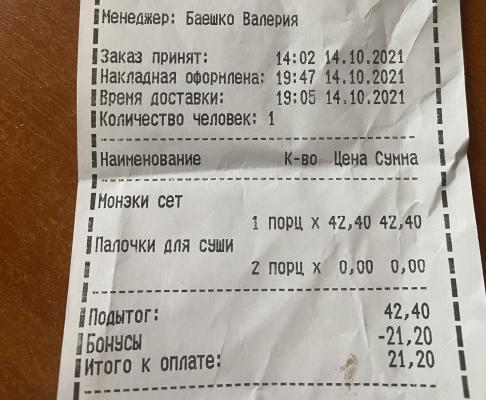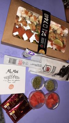 Суши свежие и вкусные, правда немного разваливались, для меня это не критично, главное вкус. Заказываю не в первый раз, и позаботилась о проведении вечера заранее: сделала заказ в 14.02 на время 19.05, а забрала заказ в 19.47!!!