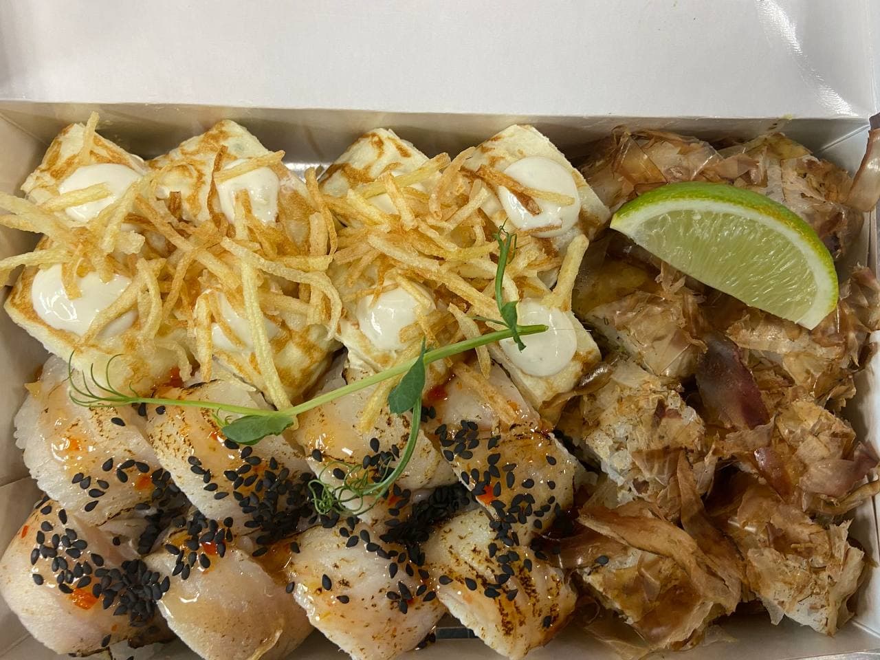 Заказывали Такаси сет, очень необычно. Особенно понравился ролл в опаленном сыре. Рыбы, конечно, в этом сете маловато, но для разнообразия очень даже неплохо. Доставка вовремя, всё ок.
