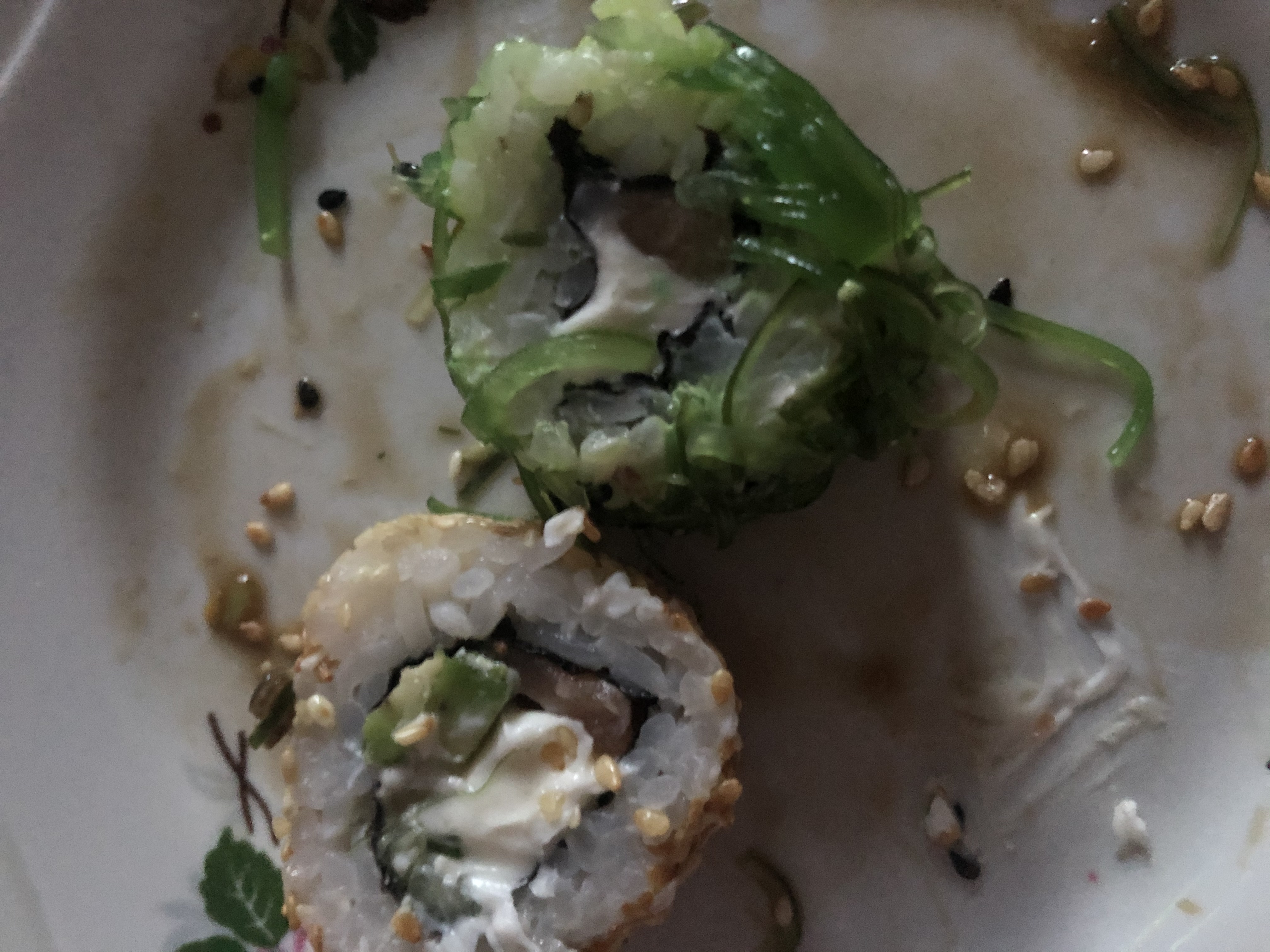 Кунжут для посыпки второго вида был жареный и сладкий. Хлопья тунца тоже какие-то непонятные. В итоге снова половину выбросила.
