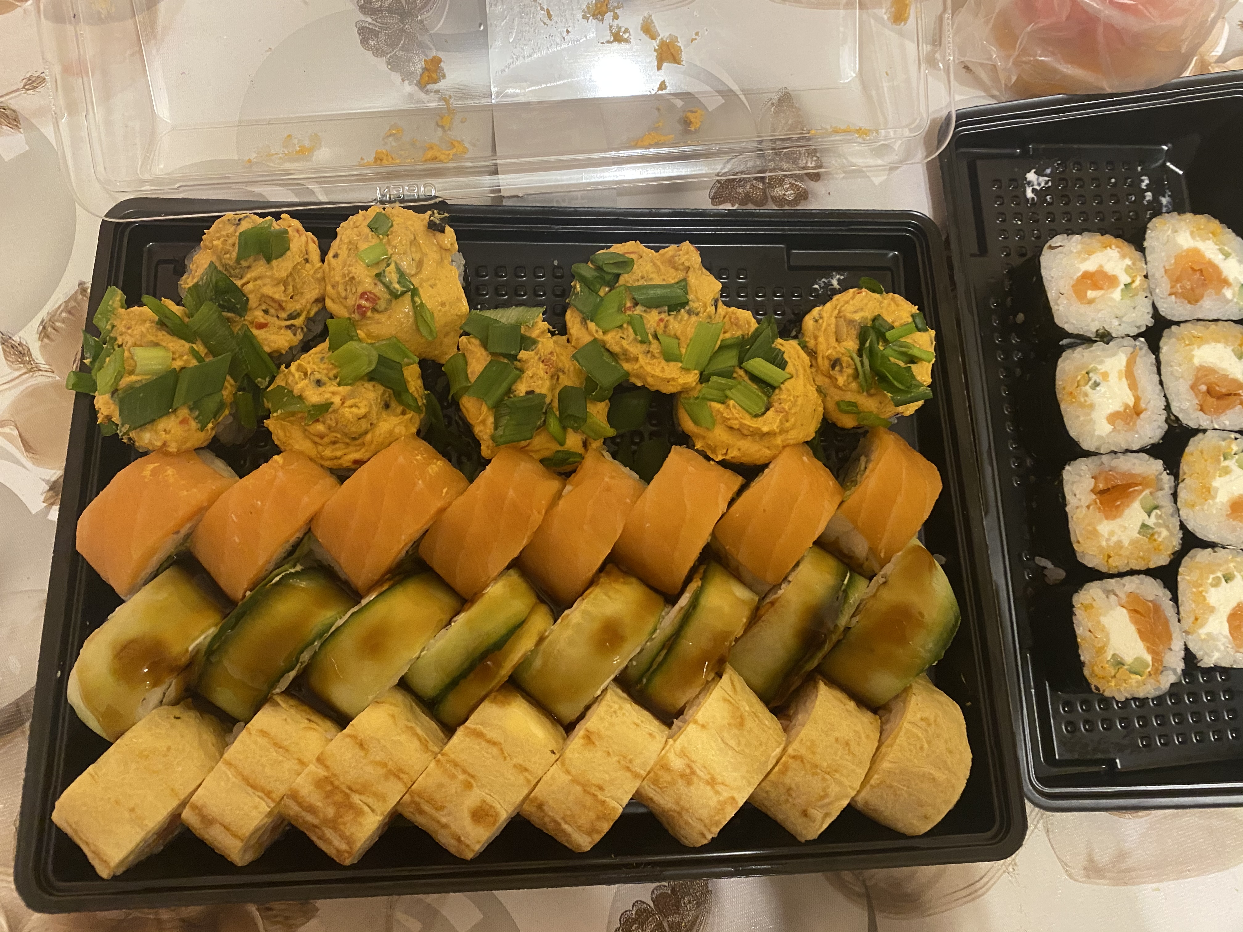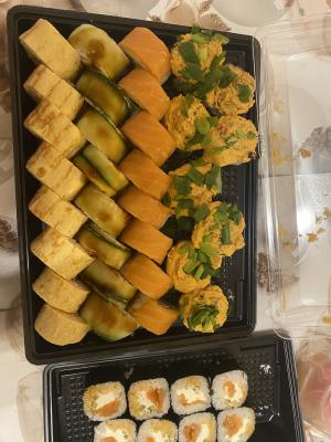Заказывали сет Фудзияма, всё понравилось, хотя суши в блинчике были без заявленного кранч бекона. В остальном вопросов нет, всё вкусно. Заказ приготовили минут за 20 (самовывоз).