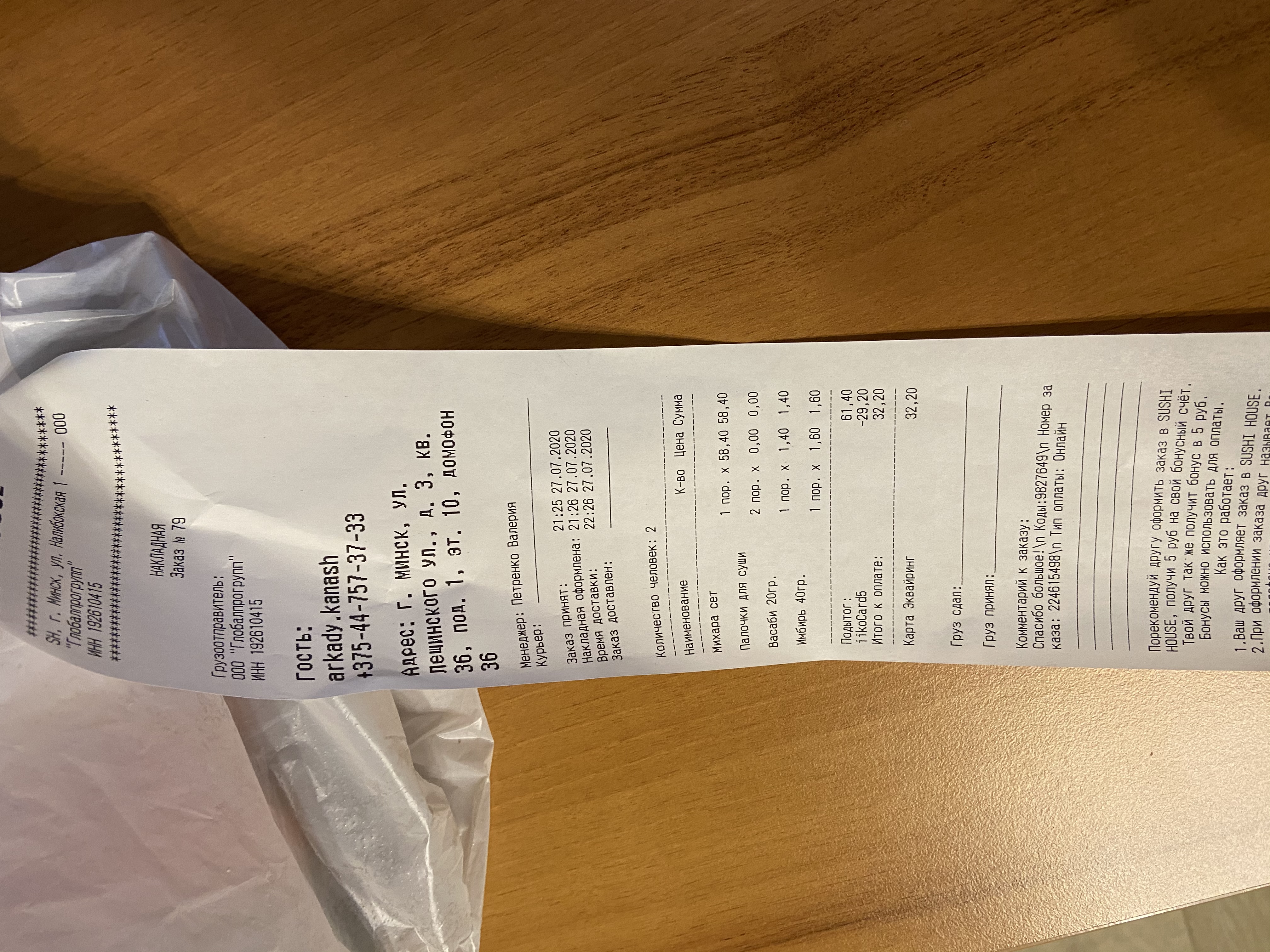 Заказал суши 27.07.2020, в заказ забыли положить васаби и имбирь... связался с оператором, сказали произошла ошибка и мол следующий раз при заказе васаби и имбирь бесплатно. Здорово конечно, а что мне делать сейчас, подумал я и пошёл в ближайший магазин за имбирем и васаби...