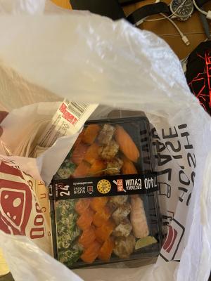 Сегодня заказывали сет Кодзима на вынос с Титана. Вкусно, но недовес немного огорчил. Заявленый весь 1380гр без коробки , а у нас 1349гр вместе с коробкой (((((
