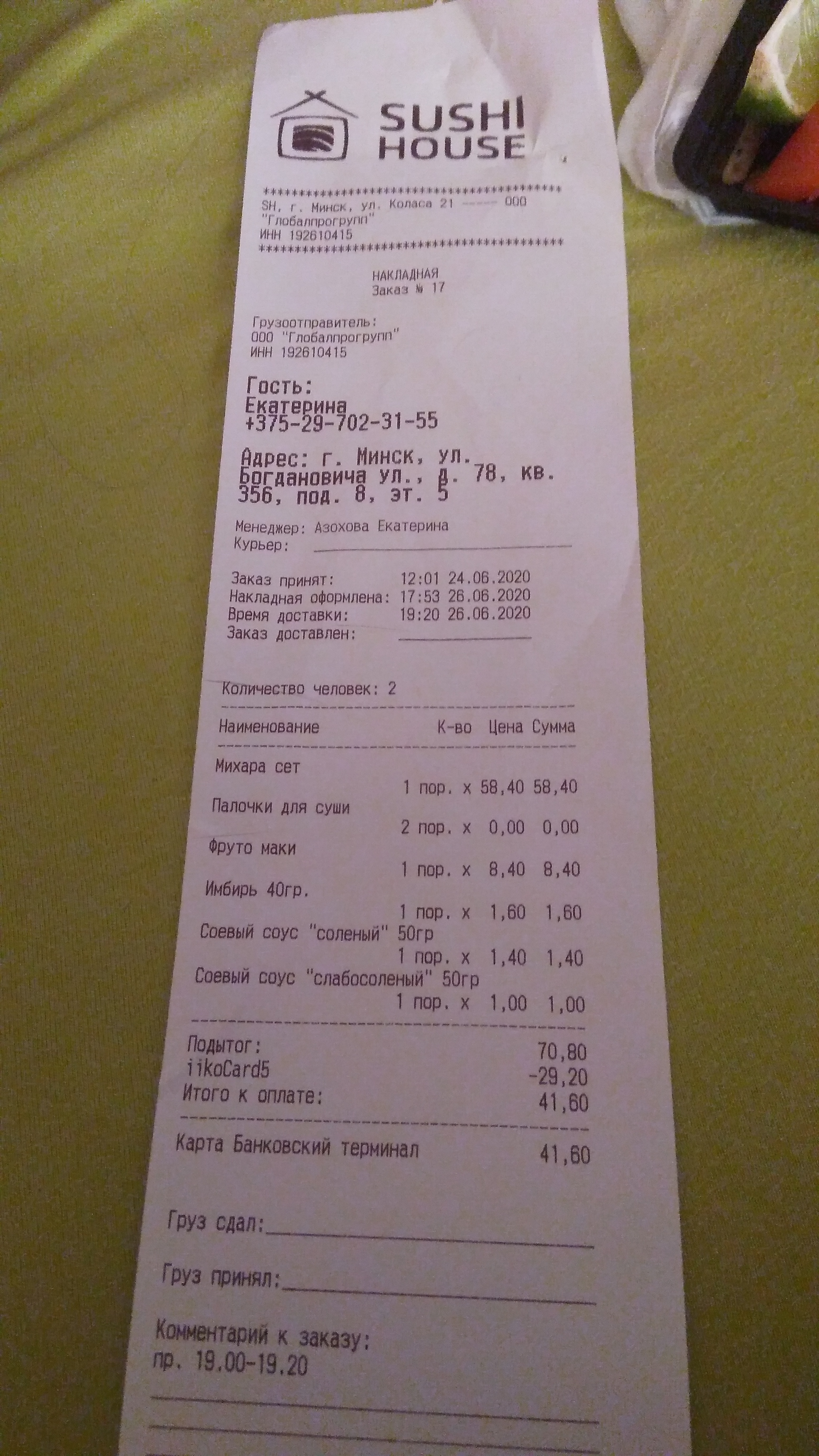 разместил заказ номер 94 /95 через кол-центр 24.06 на самовывоз с Логойского тракта и сразу возник вопрос: Пад тай есть на скидке, а у оператора почему-то нет, предложили ролл в подарок, ОК! Спросили сколько комплектов палочек, ответил 2. При выдаче заказа администратор Ефимчик Ольга, сказала что ролл в подарок идёт только к суши, ну ладно - согласился. Забрал заказ и уехал, в итоге только один комплект палочек на двоих и испорченный вечер (вилок вообще нет, хотя в прошлый раз при заказе "без сливок" было 2 вилки на двоих) Прошу руководство разобраться в ситуации, так-то у вас вкусно, а сервис хромает