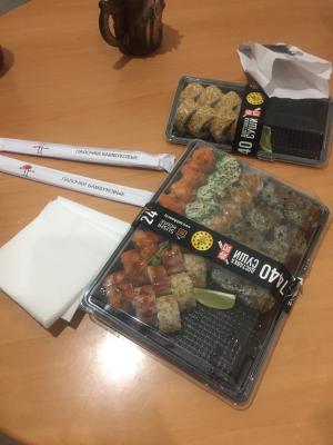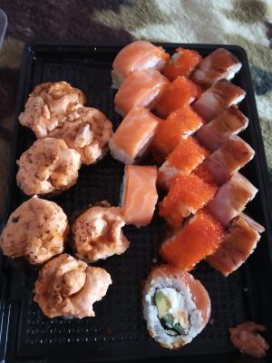 Суши вкусные, свежие. Быстрая доставка, но к сожалению попалось несколько костей. Неприятно.