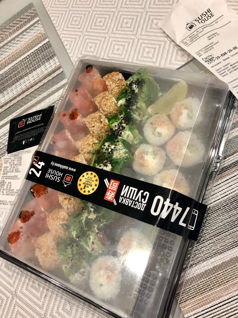Заказывал с точки самовывоза Логойский тракт (обычно забираю на Дзержинского), думал что и тут должен быть какой-нибудь "косяк" со стороны Sushi House, мало ли на дзержинского всегда делают хорошо. Но нет, сделал заказ около 19:30, пришло СМС, что в 20:00 всё будет готово.