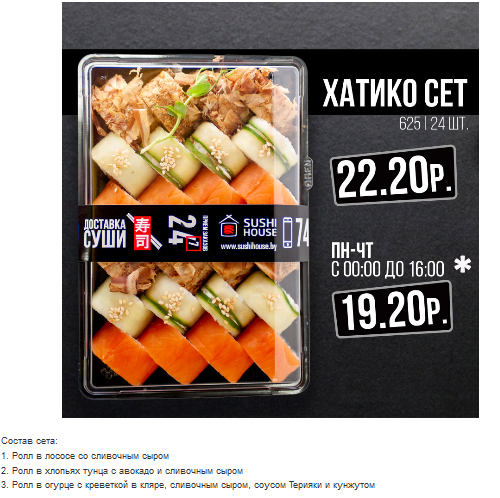 - Промокод дает право на скидку до 59% на суши-сеты от "SUSHI HOUSE"