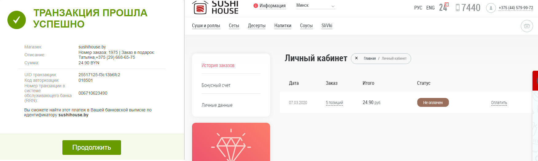 Захожу в админку сайта, историю заказов и вижу статус заказа не оплачен.