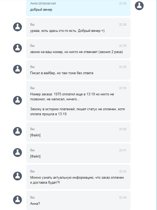 Чек на оплату есть. Деньги с карты списали. Решил позвонить по тел. 7440, но за 3 раза никто так не поднял и не перезвонил. Решил написать в вайбер (нажал на ссылку на их сайте), но там тоже никто не отвечает. Решил написать в чат на сайте и урааа, бинго! Мне написали Добрый вечер и на этом все, больше ответа не было.
