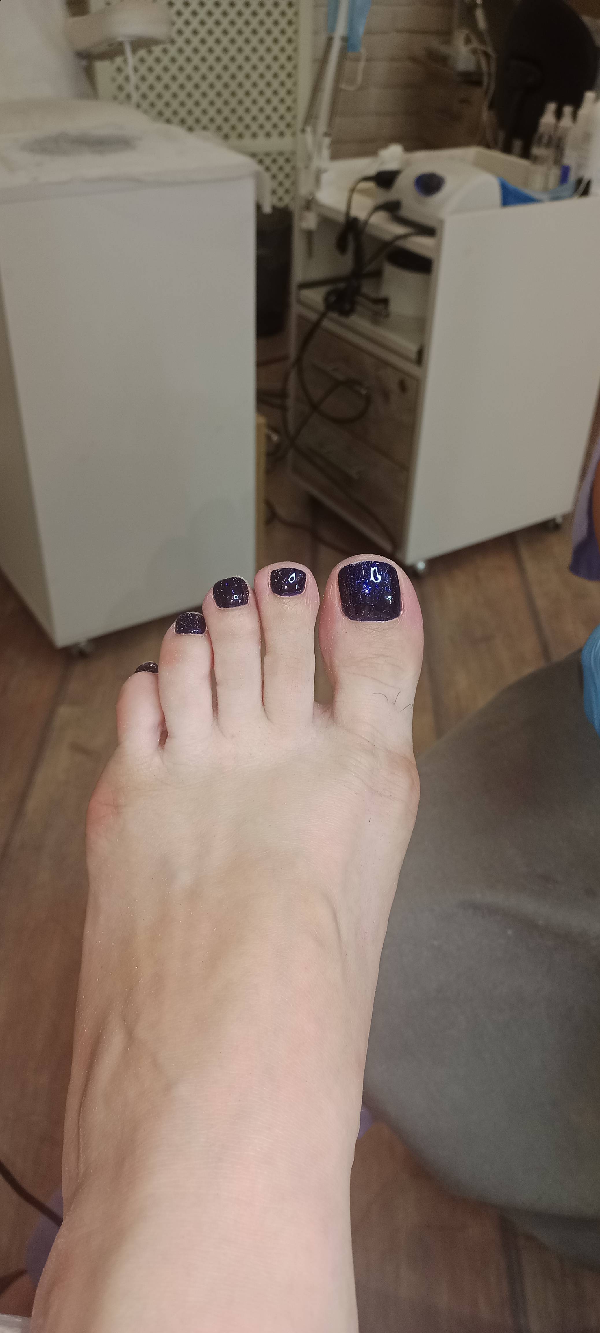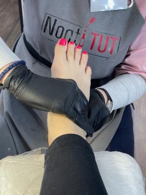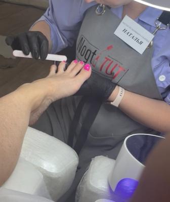 - обработка ногтей пальцев ног: придание формы ногтям, гигиеническая обработка кутикулы и боковых валиков аппаратным способом с использованием абразивных стерильных фрез, или комбинированным способом (фрезы + ножнички/кусачки), масло для кутикулы