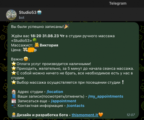 - Для просмотра окошек и записи предлагаем вам воспользоваться услугами нашего сервиса онлайн записи в Telegram Если у вас останутся вопросы, напишите пожалуйста нам, мы с радостью вам ответим