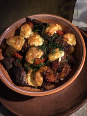 Скоблянка (390 г) Состав: говядина, куриное филе, лук, мясной соус, обжаренный картофель, свежие томаты, обжаренный перец, лук порей |