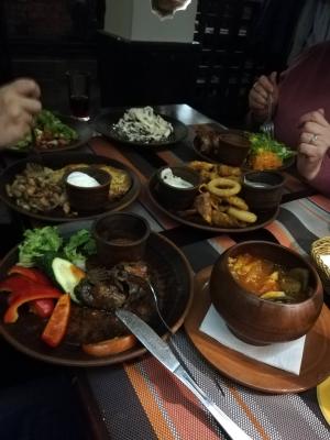 Мачанка с блинами/драниками (500 г) Состав: свинина, колбаски домашние, лук, лисички, белые грибы, шампиньоны, сметанный соус, мучные блины/драники Подается в горшочке |