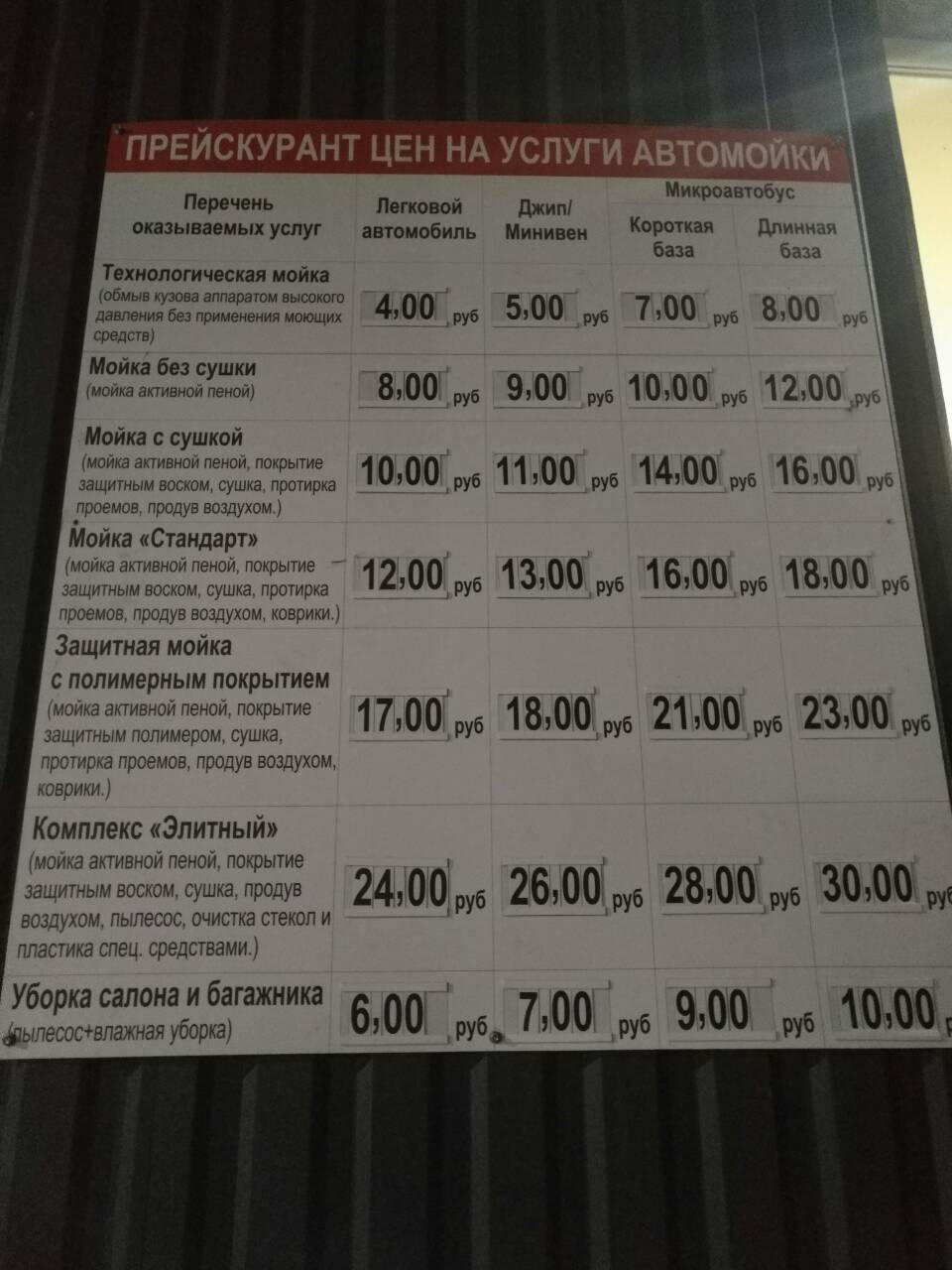 - комплекс "Премиум" (сбив, шампунь, воск, сушка кузова/проемов, чистка (мойка) ковриков, обдув):