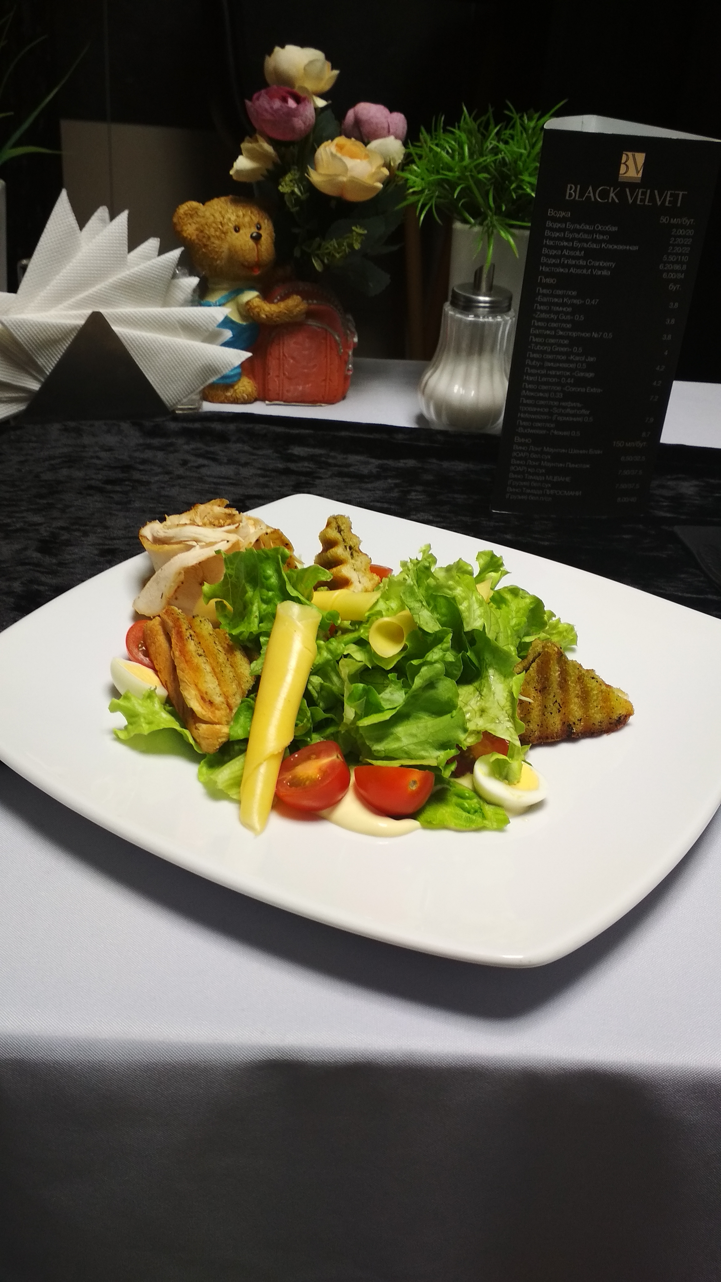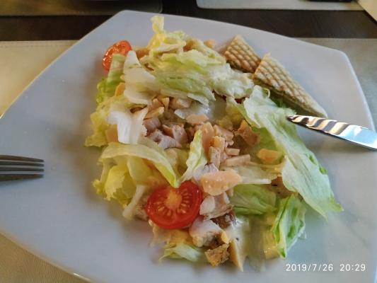 - салат "Цезарь" (220 г): салат айсберг, куриное филе, томат черри, яйцо перепелиное, соус фирменный цезарь, сыр пармезан, гренки