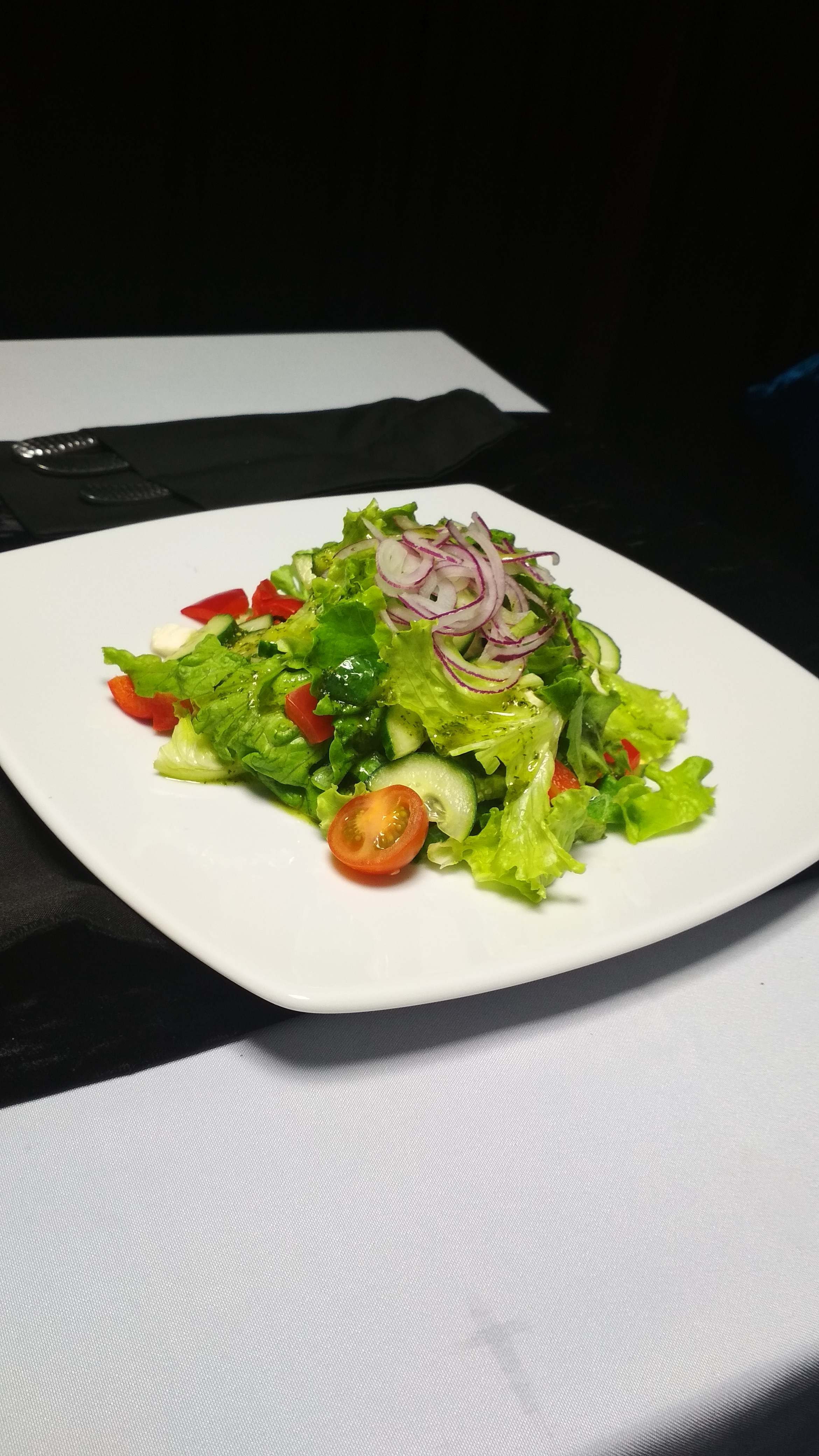 - салат "Адриатический" (220 г): салат айсберг, морской коктейль, огурец, сыр пармезан, соус фирменный