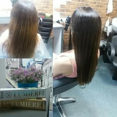 - окрашивание волос в один тон красителем Lumiere от Tahe (Испания), Estel (Россия) на выбор