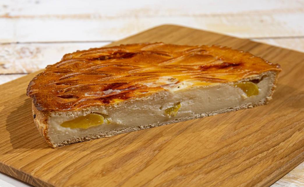 - пирог "С творогом и персиком" (1200 г): дрожжевое тесто, творог, сахар, яйцо, сметана, персик консервированный