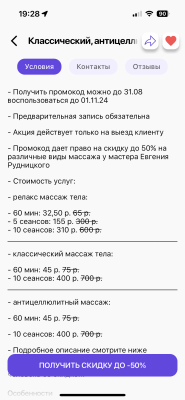 Хочу поделиться своими впечатлениями от массажа. Я проходила курс антицеллюлитного массажа - 10 сеансов. Результатом очень довольна!! Соблюдая рекомендации, и приложа собственные усилия совместно с данным массажем - все будет супер!! Всем советую Евгения, приятный молодой человек, который поможет вам достичь результатов, тем более что выезд на дом - это очень комфортно))