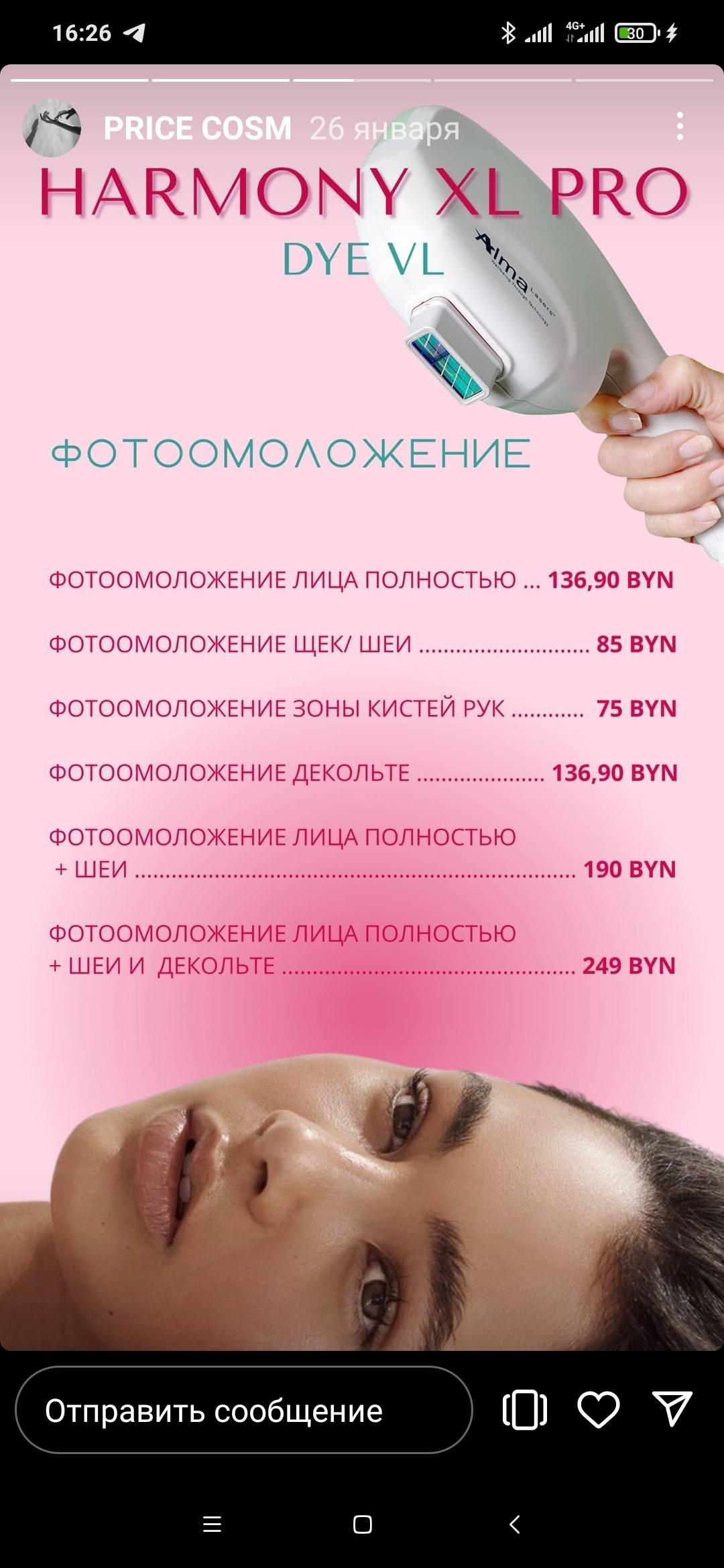 Добрый день! Подскажите, в чем смысл вашей акции фотоомоложения на Сливках, если у вас в Инстаграм прайс дешевле и без акции? Лицо -139 по акции, 136 - без акции . Спасибо.