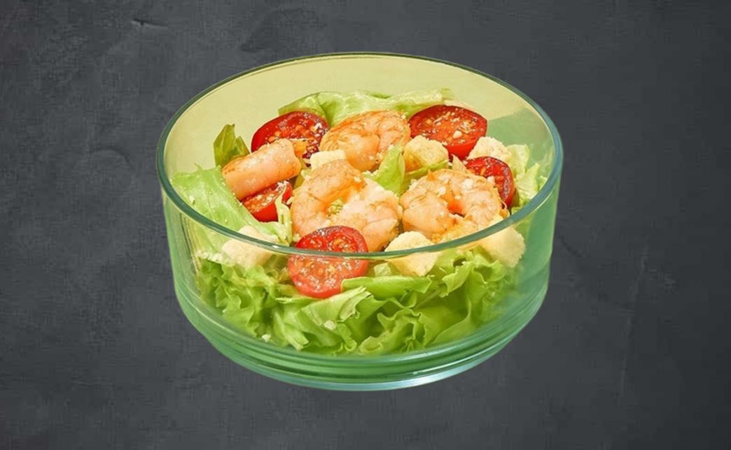 Состав: королевская креветка, листья салата, томаты черри, соус цезарь, гренки, сыр пармезан