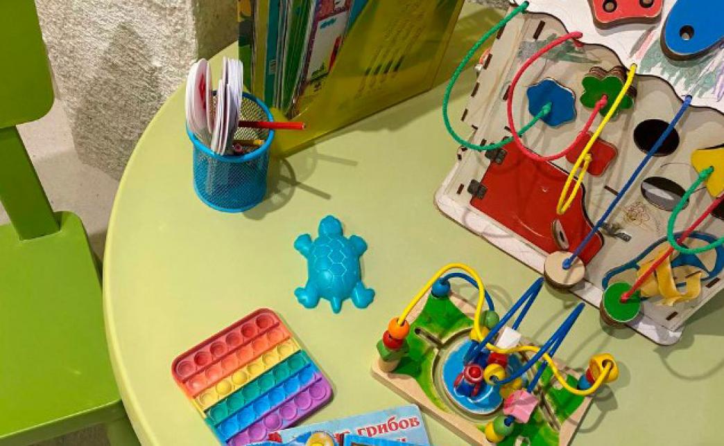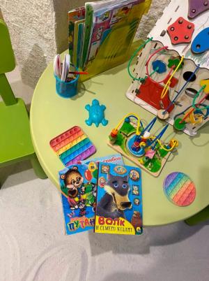 - Игровая зона для детей: световой стол для рисования, бизидом, игрушки, конструкторы, формочки и совочки.
