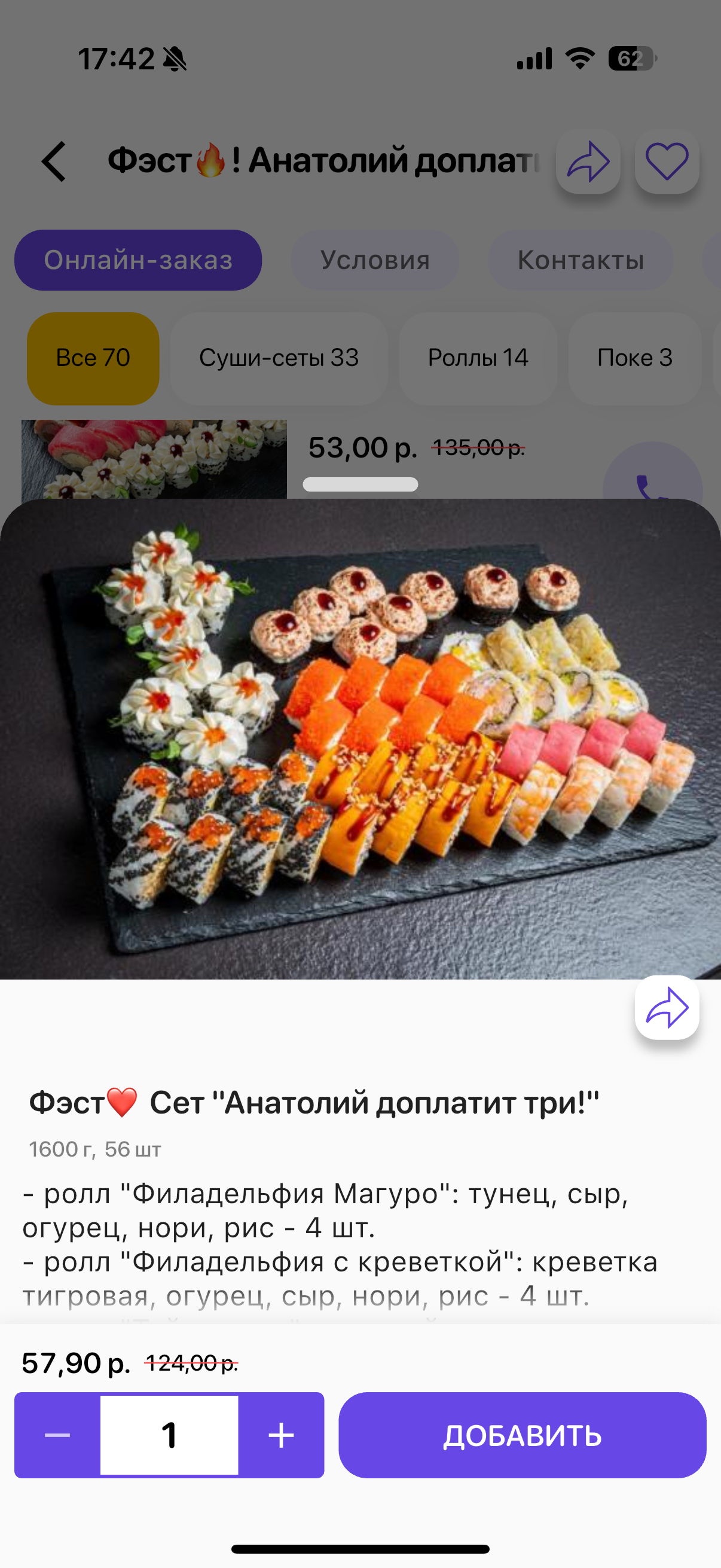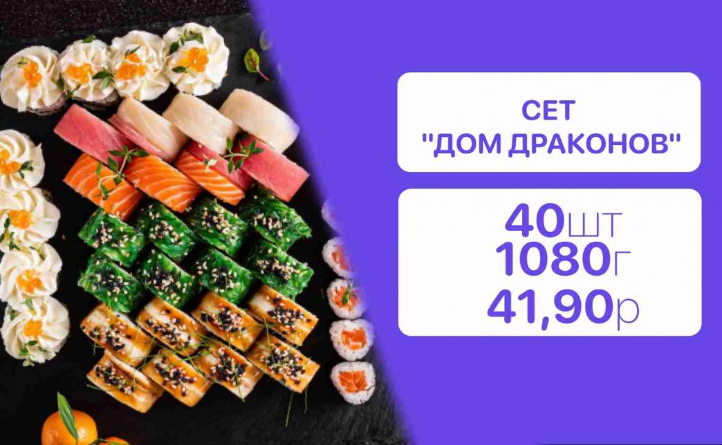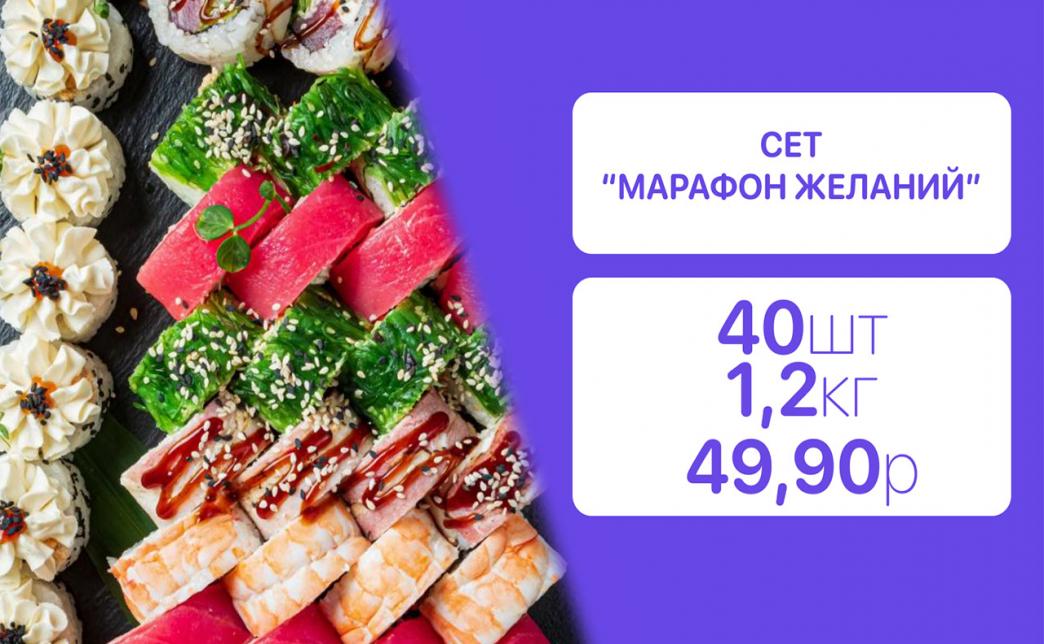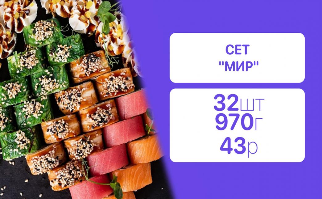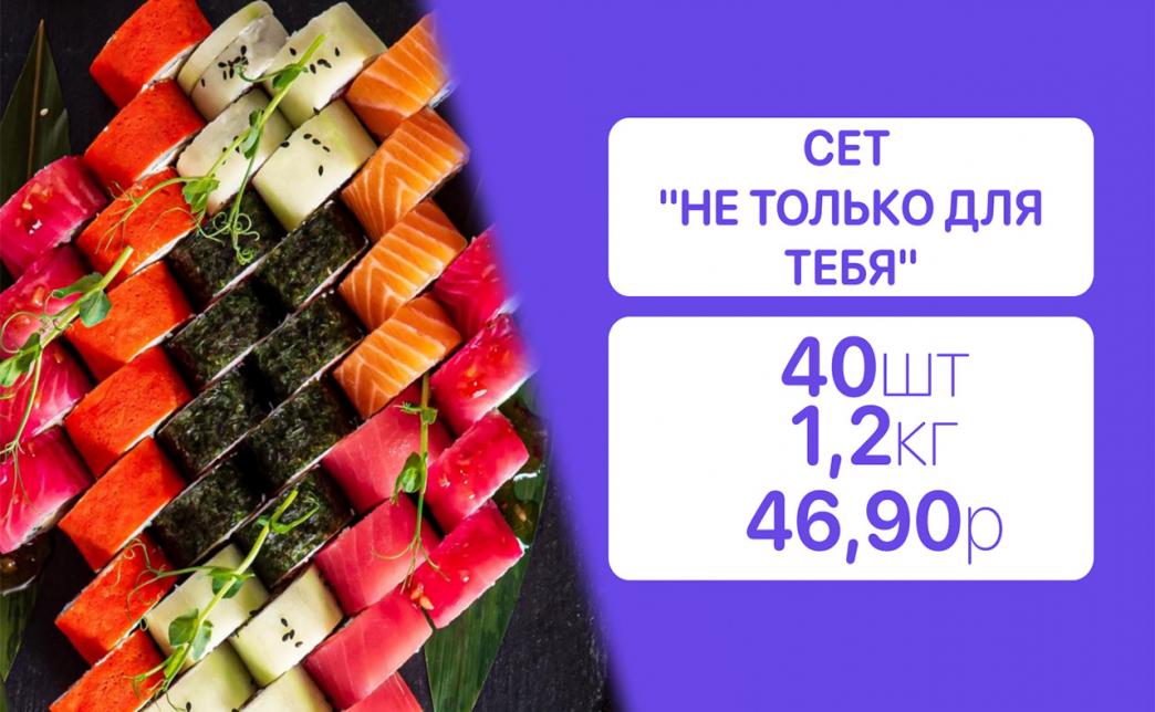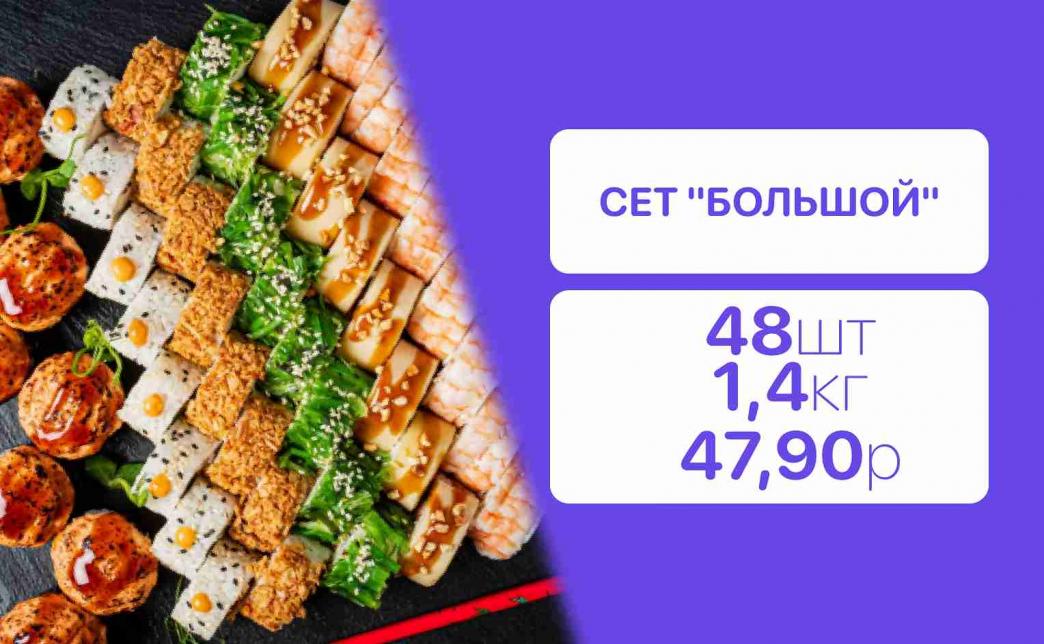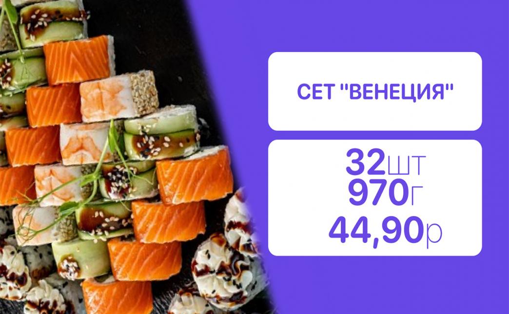 - Стоимость суши-сетов: от 32,90 р. от 58 р.